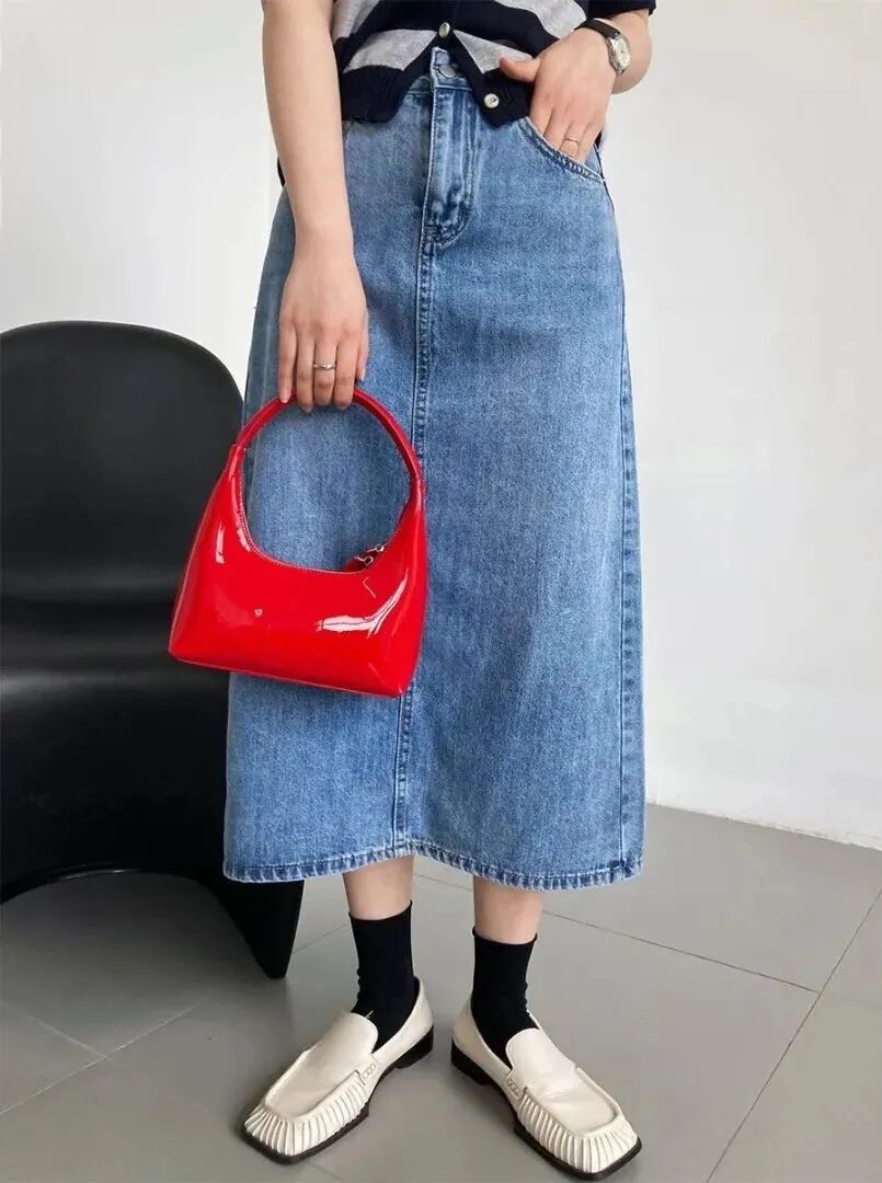 再穿一条深色牛仔半裙,又搭出了几分潇洒劲。