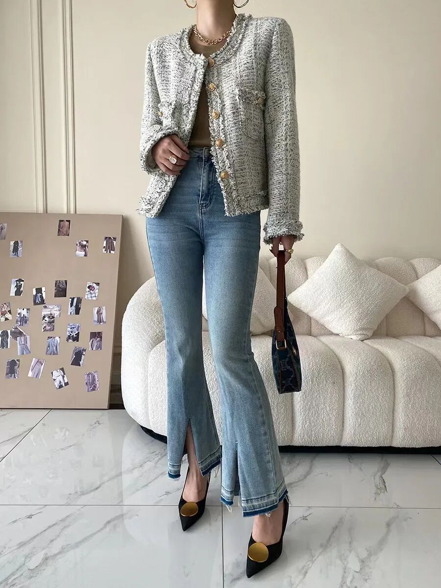 下身随便抓一条衣柜里的牛仔裤,就能马上出门。搭配长款微喇的裤子,更拉长腿部线条比例哦!
