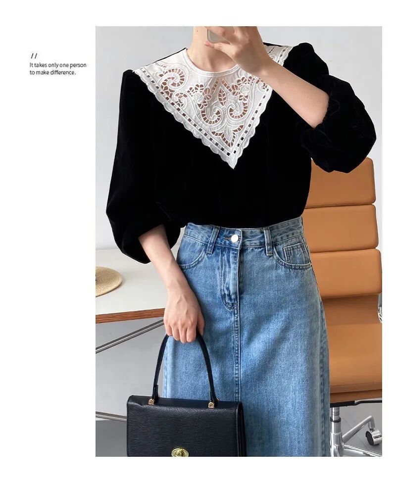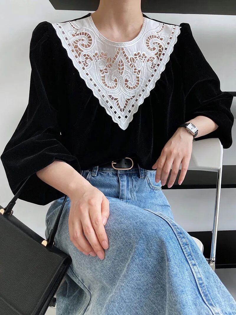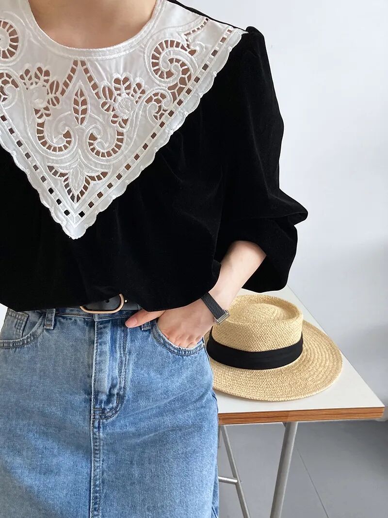 这种和传统娃娃领不同,圆领改成了尖领,各种小细节的设计展现出丰富层次感,为清甜造型增添了一丝酷感。