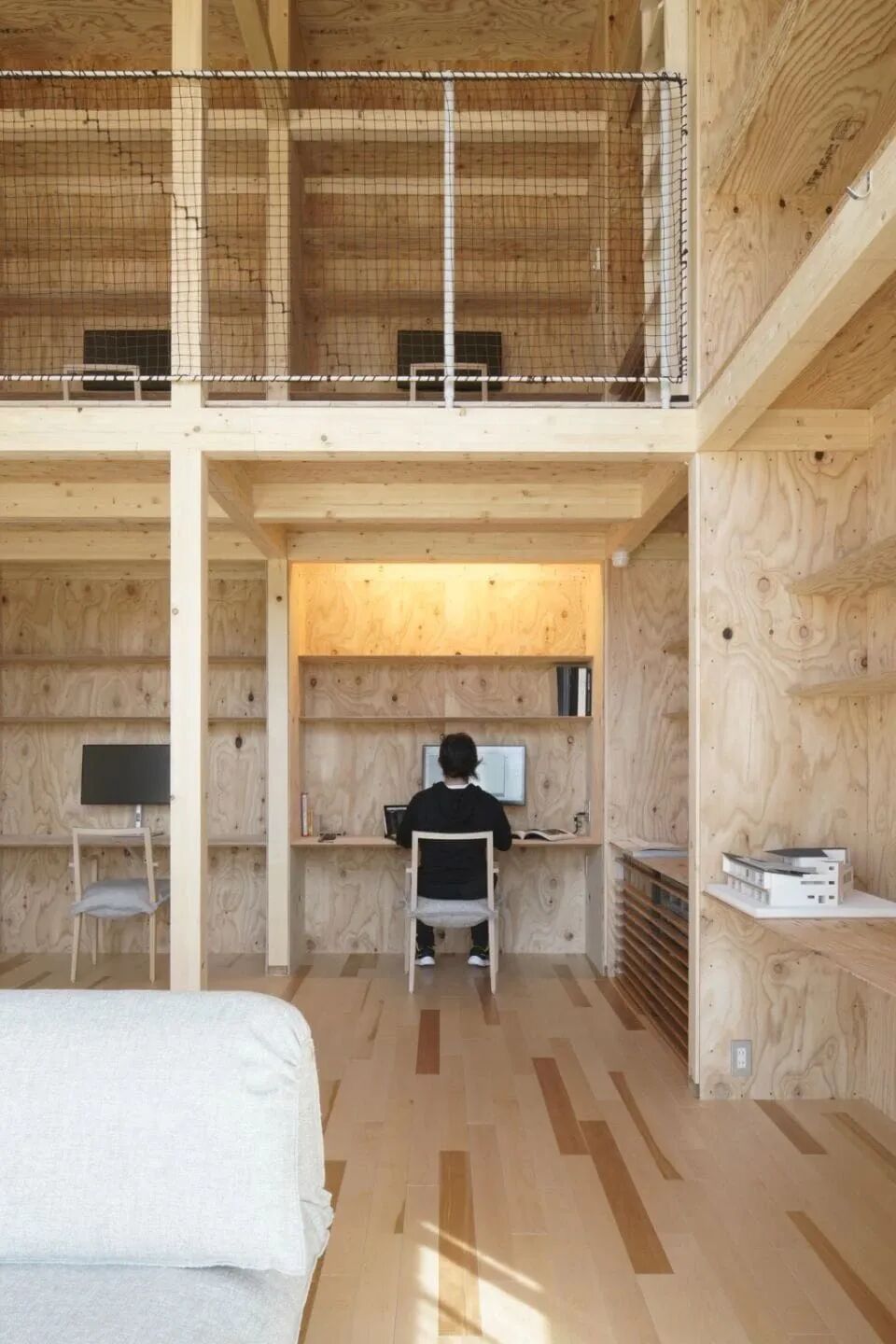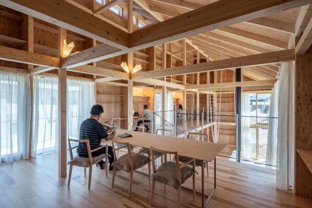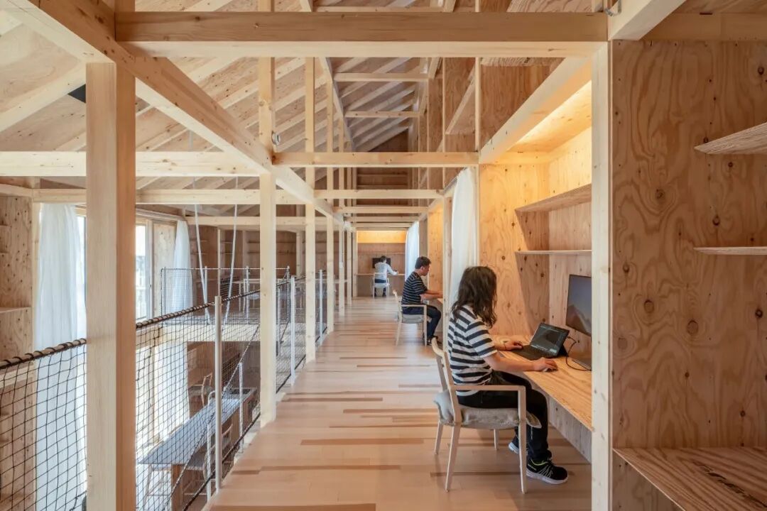 茂密的森林是天然的木材来源,设计师就地取材,在这里造了一个用木材打造的共享办公空间,整个项目包含了厨房,厕所,生活空间以及会议室。
