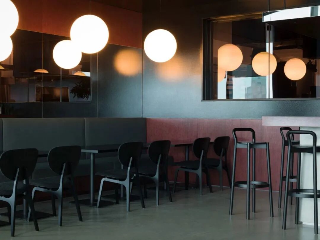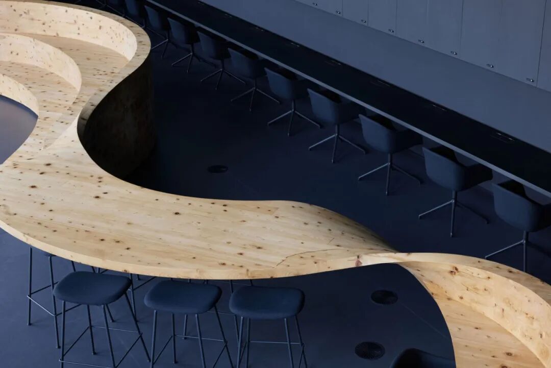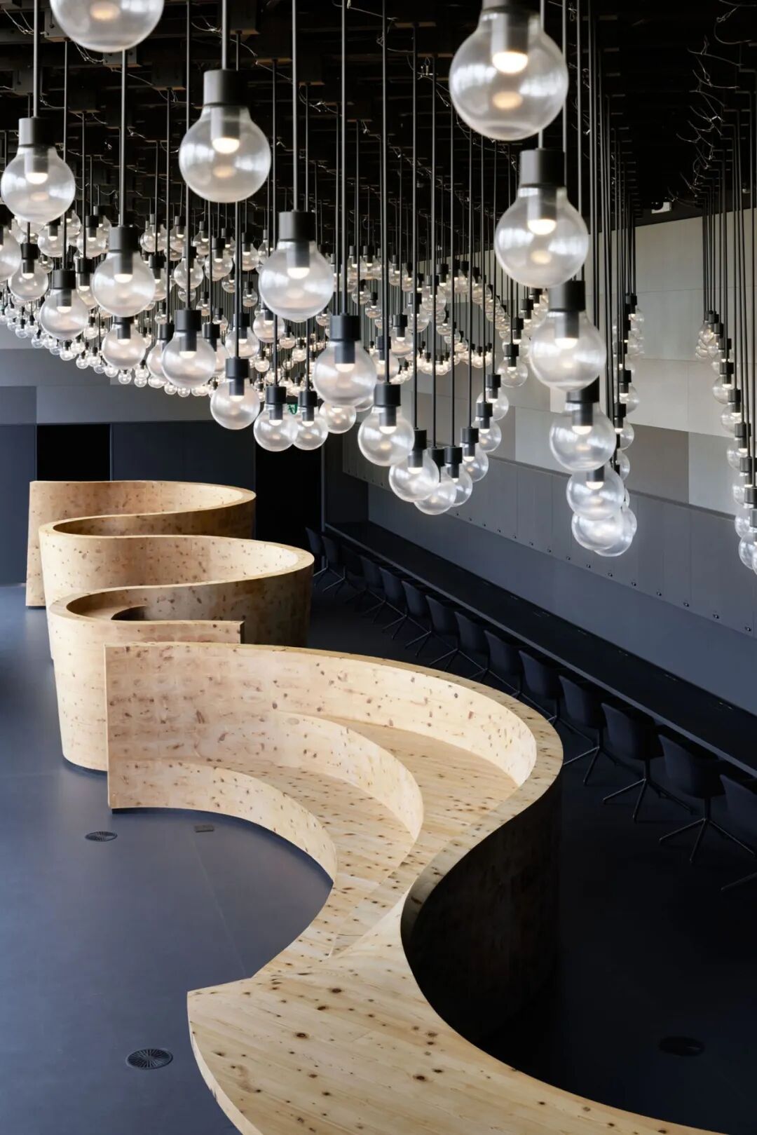 杉木制作的家具飘散着自然木材香,蜿蜒绵长的线条,营造一种流动的氛围;屋顶由由534个灯泡组合而成,在天花板上描绘出优美曲线。