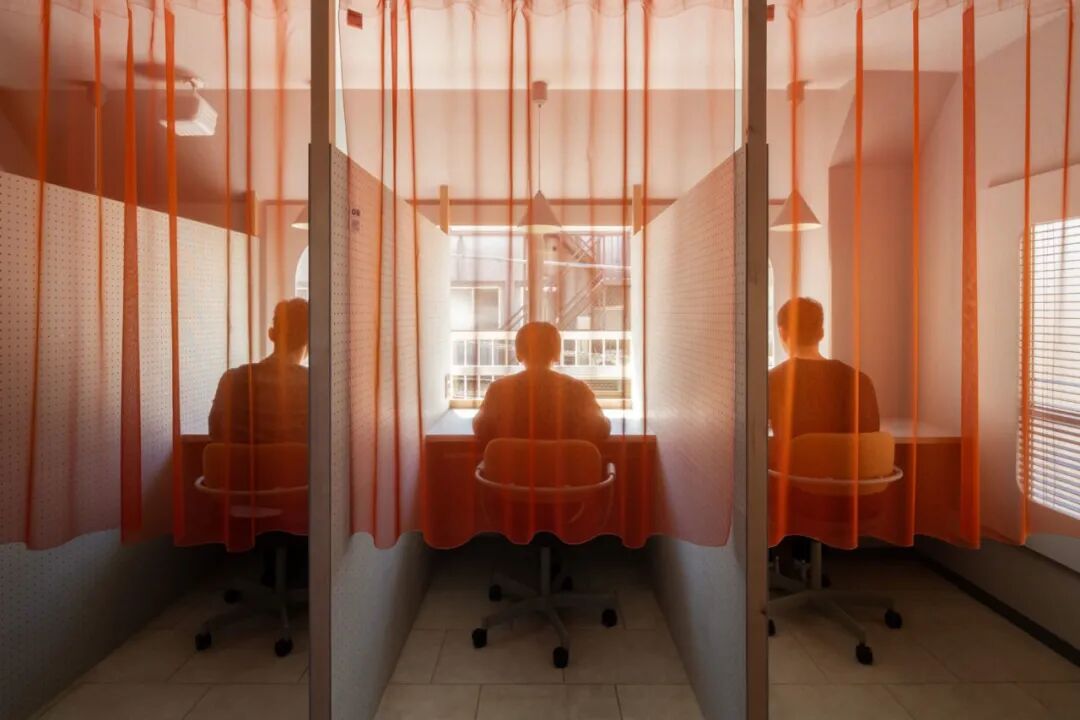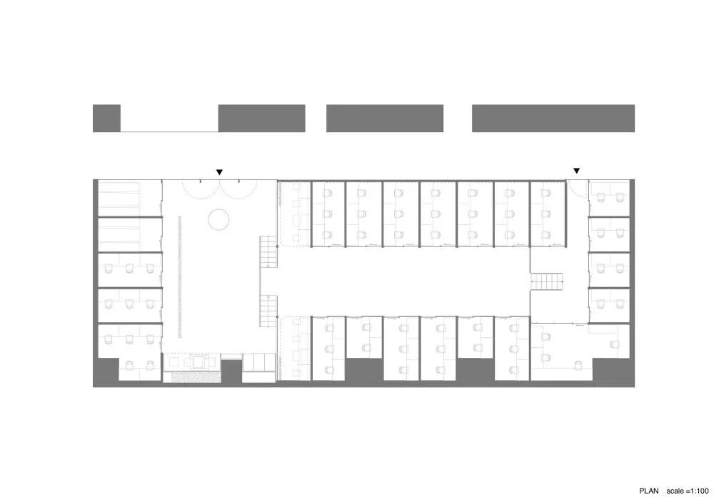 整个项目的原址中,拥有多根承重横梁,设计师将两个、三个和六个人的工作区被安排在一个盒子状的结构中。