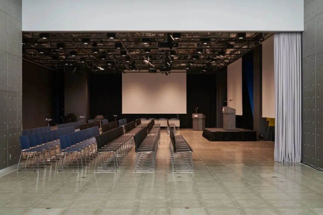 中部公共空间,联通了各个区域,这里是一个自由活动区域,陈列了一些圆桌椅、矮凳等区域,尽量营造一种开放的氛围。