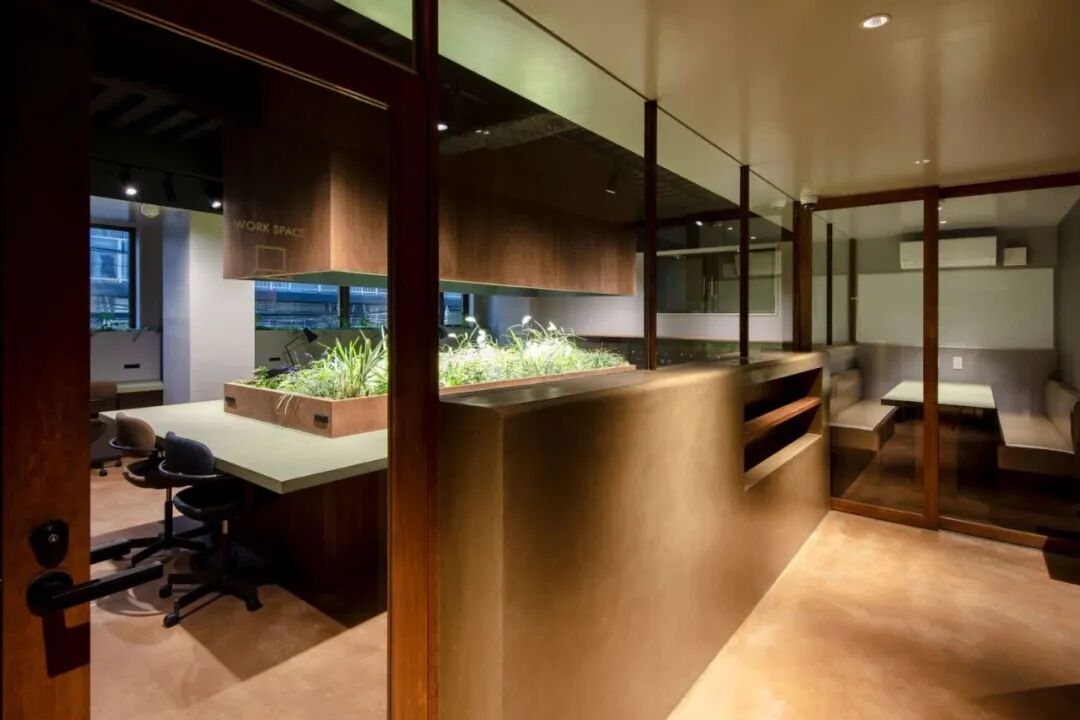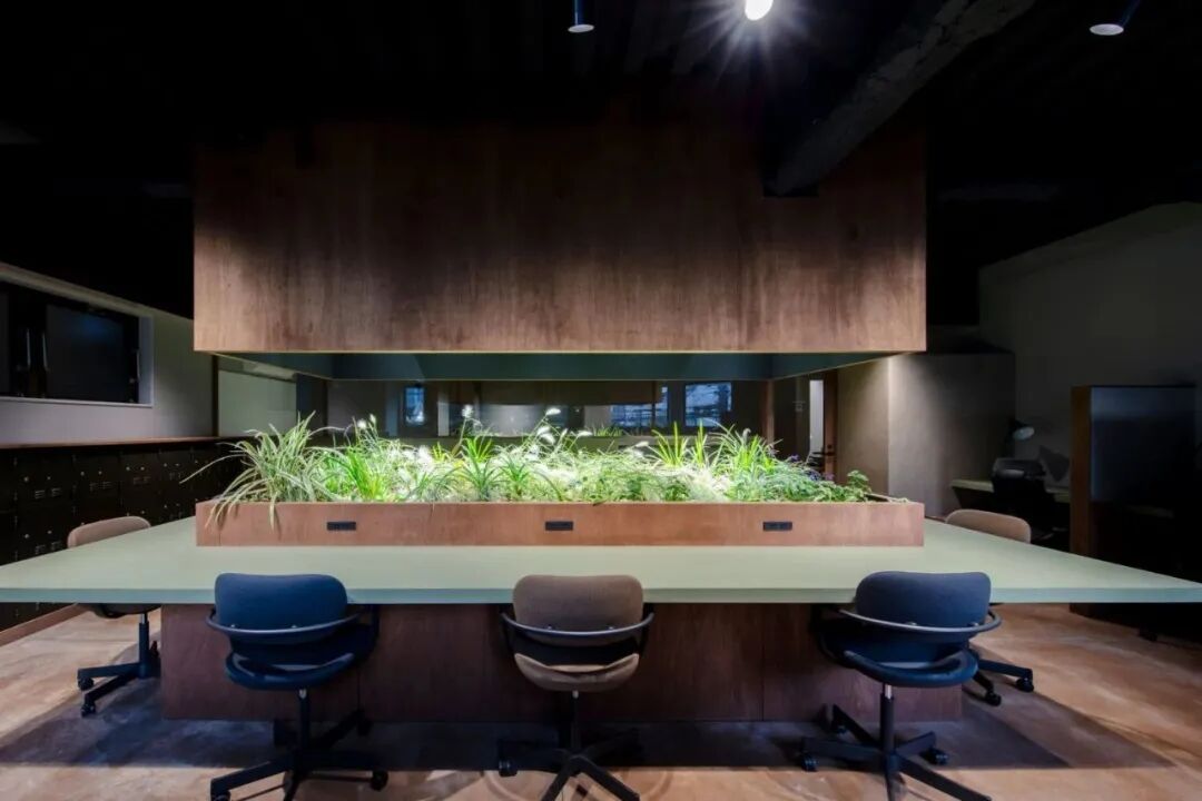 外围的办公空间是传统的圆桌和椅子,设计师将外部庭院的花盆设计大胆运用到室内来。