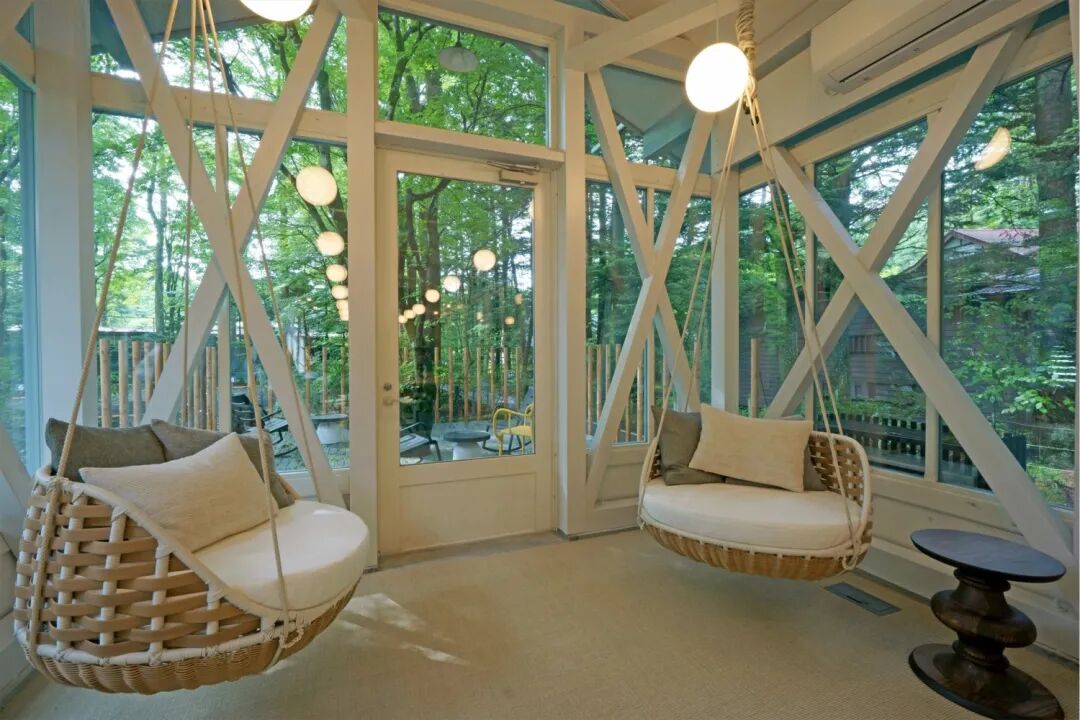 设计师在室内设计了多个休闲的吊椅,方便工作劳累的时候放松休闲。