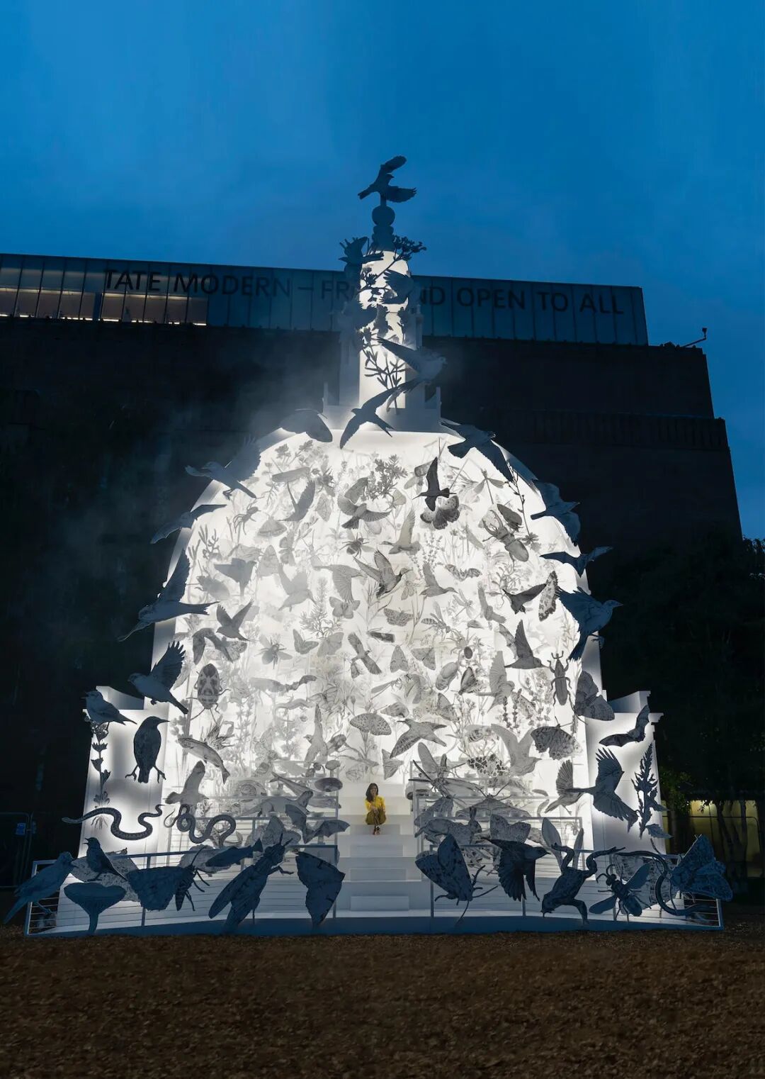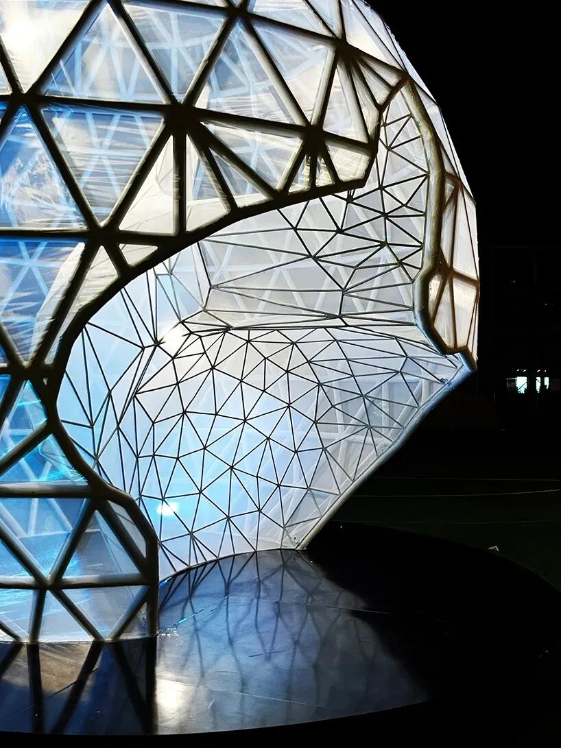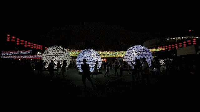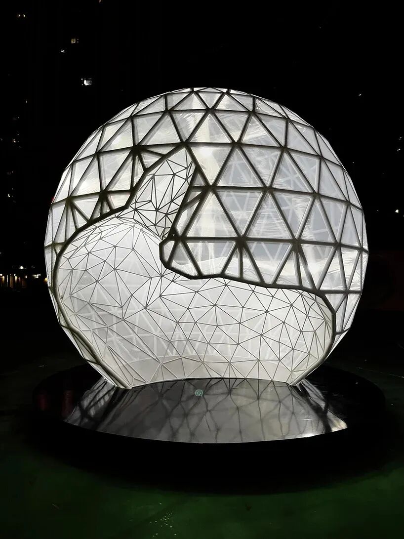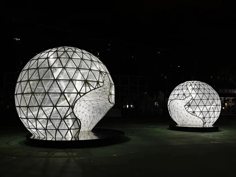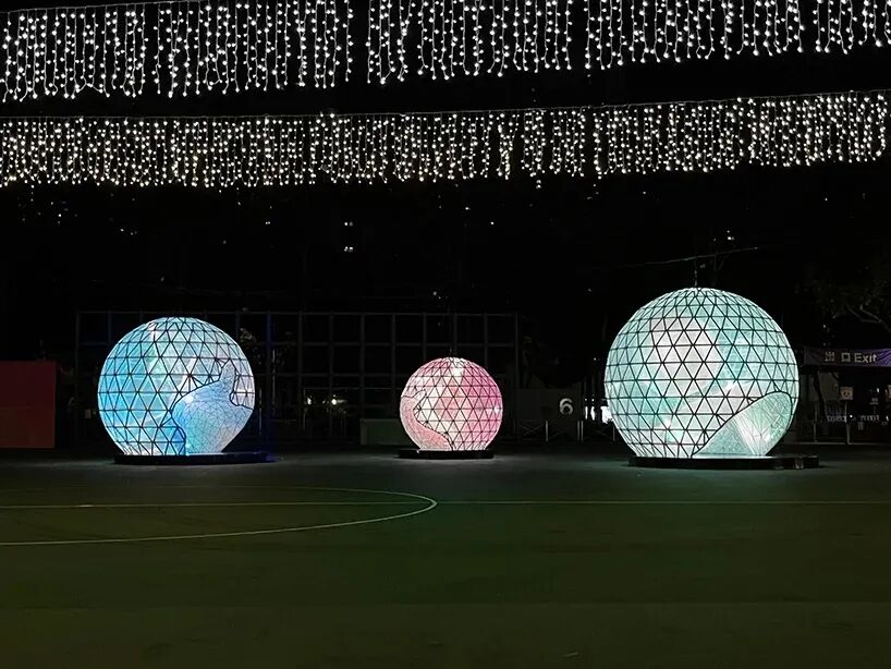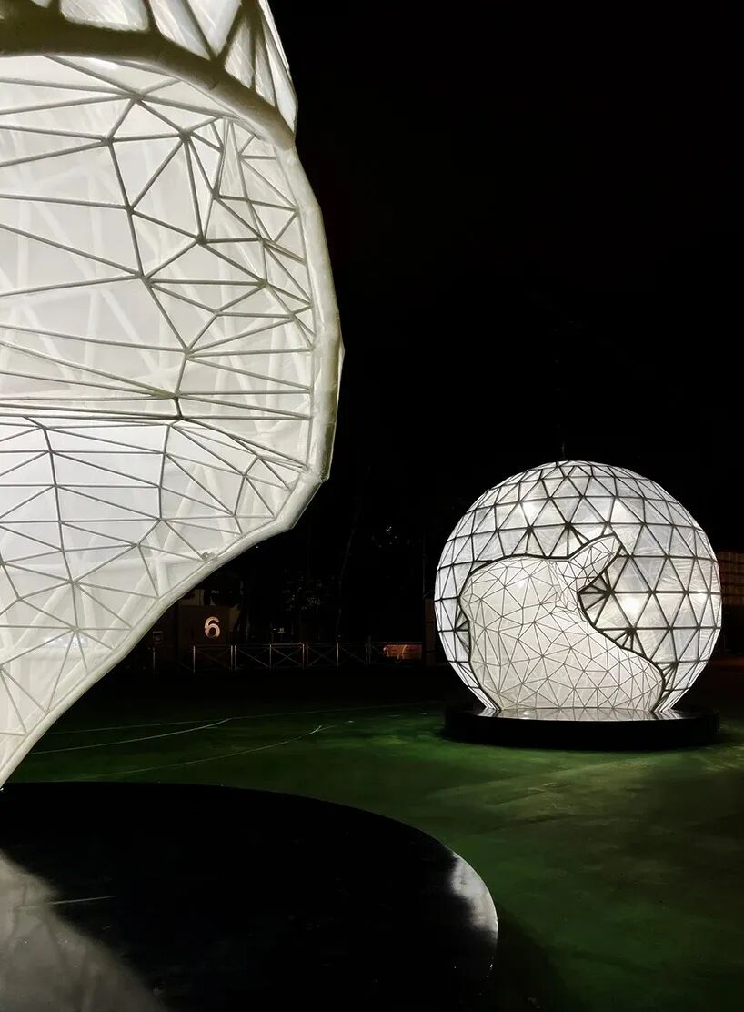 Ida & Billy Architects工作室为庆祝2022年中秋节,用球形编织的灯笼照亮了维多利亚公园的一个足球场,诠释了古老的民间祭月故事。作品装置是一个3D戏剧空间,由三个点燃的三角形大地球组成,其缩进的形状是跳跳兔和圆月的标志性人物。焊接结构的三角球将月亮、兔子和山丘与纹理和阴影联系在一起,引发了自古以来人类的好奇心、想象力和探索。