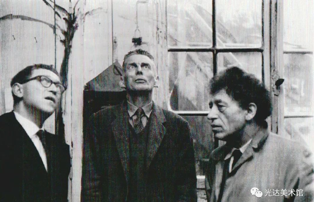 从左到右:阿利卡、贝克特、贾科梅蒂,在贾科梅蒂工作室,乔治·皮埃尔摄,1961年