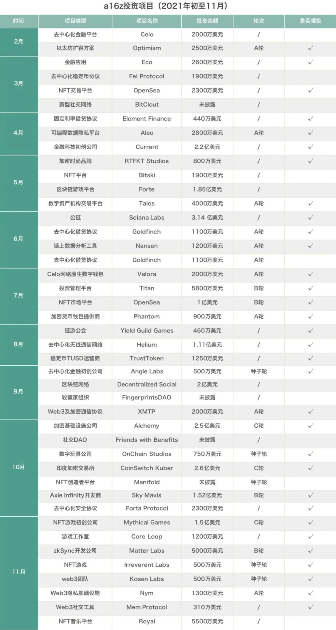 在a16z注资规模上,同样可以看出Andreessen「激进」的投资风格。自2013年起,a16z先后8次向Coinbase注资,成为该平台最大的外部投资者。而在今年,据不完全统计,a16z累计投资逾40个项目(占总投资量三分之二),其中超70%属于领投。另在NFT平台Opensea今年完成的两轮融资中,该风投均以领投方身份参与。在尚未结束的11月,a16投资8个与web3.0、游戏及NFT相关的项目,约4天进行一笔交易。足见,Andreessen带领a16z布局加密货币领域的节奏加快。