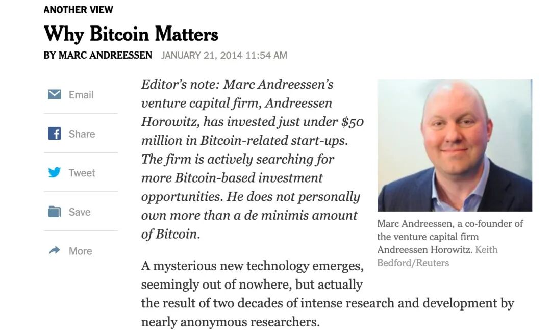 (Andreessen于2014年在《纽约时报》发文介绍比特币重要性)