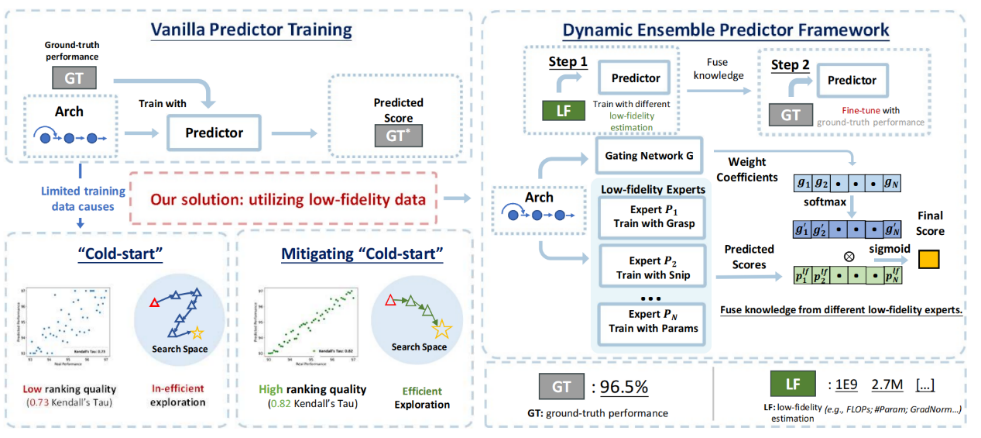 基于预测器的神经架构搜索存在严重的“冷启动”问题,因为需要大量的架构-真实性能数据才能获得一个有效的预测器。本文专注于利用低保真度信息以缓解预测器训练对大量数据的需求。为更好地融合不同类型的低保真信息提供的有益信息,本文提出了一种动态集成预测框架,在有限的数据量下大幅提升了预测器的预测能力。例如,在NDS-ResNet搜索空间中仅使用25个架构-真实性能数据,所提方法将实际性能与预测得分之间的肯德尔相关系数从0.2549提高到0.7064。此方法可以轻易地与现有的基于预测器的神经架构搜索框架结合,以发现更好的架构。