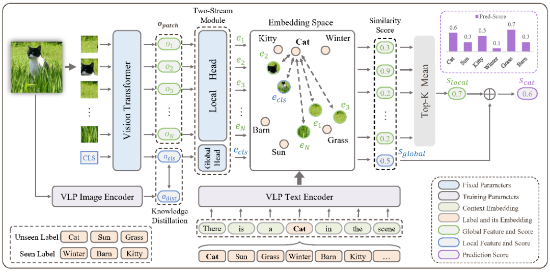 基于图文预训练模型的开放词典(Open-Vocabulary)分类模型在单标签零样本学习上取得了显著效果,但如何将这种能力迁移到多标签场景仍是亟待探索的问题。作者提出了一种基于多模态知识迁移(Multi-modal Knowledge Transfer, MKT)框架实现了多标签的开放词典分类。作者基于图文预训练模型强大的图文匹配能力实现标签预测。为了优化标签映射和提升图像-标签映射的一致性,作者引入了提示学习(Prompt-Tuning)和知识蒸馏(Knowledge Distillation)。同时,作者提出了一个简单但是有效的双流模块来同时捕捉局部和全局特征,提高了模型的多标签识别能力。在NUS-WIDE和OpenImage两个公开数据集上的实验结果表明,该方法有效实现了多标签的开放集合学习。