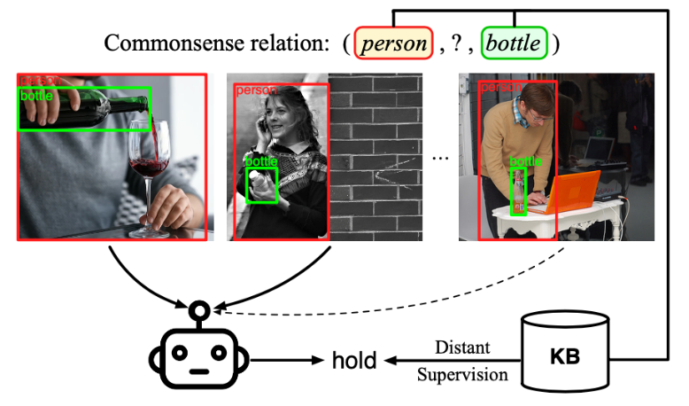 目前的常识获取方法往往只关注于文本领域的常识获取,但是这些方法受限于文本的稀疏性和报道的偏差。另一方面,视觉感知提供了真实世界中大量的常识信息,比如(人,可以抓住,瓶子)。作者提出了将视觉常识获取定义为一个远程监督的多样本学习任务,并设计了相应的框架来解决此任务。实验结果充分证明了有效性,并验证了多个模态信息的融合可以进一步提高常识获取的质量。