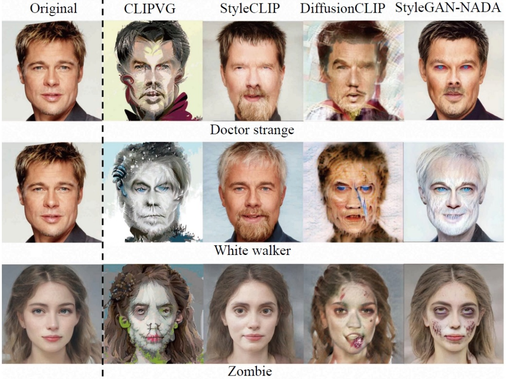 研究者接着对比了针对特定领域图片 (以人脸为例) 的像素域方法,包括 StyleCLIP、DiffusionCLIP 和 StyleGAN-NADA。由于对使用范围进行了限制,这些 baseline 方法的生成质量通常更为稳定。CLIPVG 在这组对比中依然展现了不逊于已有方法的效果,尤其是和目标文字的符合程度往往更高。