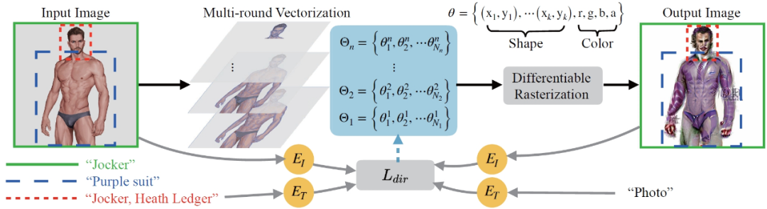 CLIPVG 的总体流程如下图所示。首先会对输入的像素图进行不同精度的多轮矢量化 (Multi-round Vectorization),其中第 i 轮得到的矢量元素集合记为Θi。各轮得到的结果会被叠加到一起整体作为优化对象,并通过可微矢量渲染 (Differentiable Rasterization) 转换回到像素域。输出图片的起始状态是输入图片的矢量化重建,然后按照文字描述的方向进行迭代优化。优化过程会根据每个 ROI 的区域范围和关联文字,计算 ROI CLIP loss (下图中的),并根据梯度优化各个矢量元素,包括颜色参数和形状参数。