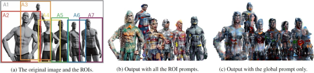 利用矢量图形的特性以及 ROI 级别的损失函数,CLIPVG 能够支持一系列已有方法难以实现的创新玩法。比如本文一开始展示的多人图的编辑效果,就是通过对于不同人物定义不同的 ROI 级别文字描述实现的。下图的左边为输入,中间为 ROI 级别文字描述的编辑结果,右边为整张图只有一个整体文字描述的结果。其中 A1 到 A7 区域对应的描述分别为 1. "Justice League Six"(正义联盟),2. "Aquaman"(海王),3. "Superman"(超人),4. "Wonder Woman"(神奇女侠),5. "Cyborg"(钢骨),6. "Flash,DC Superhero"(闪电侠,DC) 和 7. "Batman"(蝙蝠侠)。可以看到 ROI 级别的描述可以对各个人物进行分别编辑,而整体描述则无法生成有效的个体身份特征。由于各个 ROI 互相之间是有重叠的,已有方法即使对每个人物单独编辑,也很难达到 CLIPVG 的整体协调性。