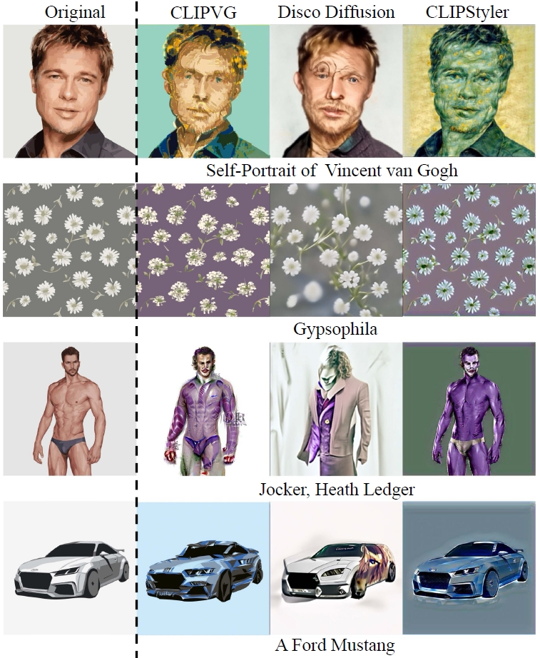 在对比实验中,研究首先将 CLIPVG 和两种能对任意图片进行编辑的像素域方法进行了对比,包括 Disco Diffusion 和 CLIPstyler,下图中可以看到对于 "Self-Portrait of Vincent van Gogh" 的例子,CLIPVG 能够同时对于人物身份和绘画风格进行编辑,而像素域方法只能达到其中的一项。对于 "Gypsophila",CLIPVG 相对 baseline 方法能更精确地编辑花瓣的数量和形状。在 "Jocker, Heath Ledger" 和 "A Ford Mustang" 的例子中,CLIPVG 也能鲁棒地改变整体语义,相对来说 Disco Diffusion 容易出现局部瑕疵,而 CLIPstyler 一般只是调整了纹理和颜色。