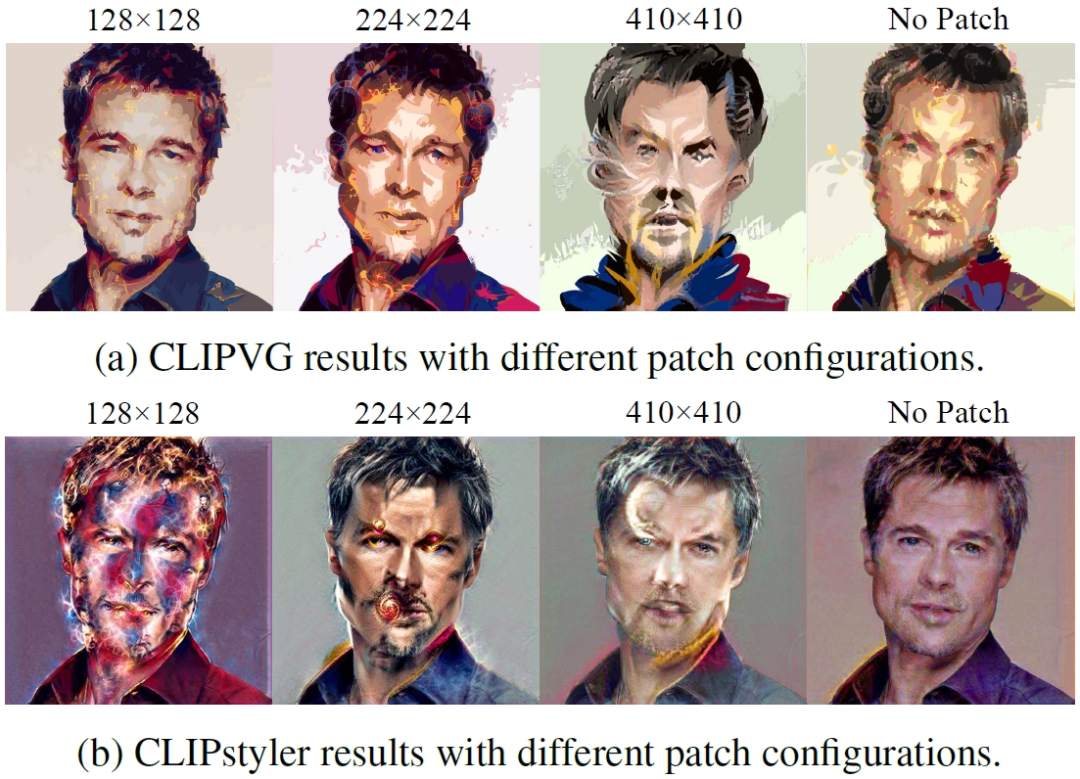 为了进一步研究矢量域优化的特性,论文对比了 CLIPVG (矢量域方法) 和 CLIPstyler (像素域方法) 采用不同 patch size 进行增强时的效果。下图中第一行为 CLIPVG 采用不同 patch size 的效果,第二行为 CLIPstyler 的效果。其文字描述为 "Doctor Strange"。整张图的分辨率为 512x512。可以看到当 patch size 较小 (128x128 或 224x224) 时,CLIPVG 和 CLIPstyler 都会在局部小块区域出现 "Doctor Strange"(奇异博士)代表性的红蓝配色,但是整张脸的语义并没有明显变化。这是因为此时的 CLIP 引导没有施加到图片整体。当 CLIPVG 将 patch size 增加到 410x410 时可以看到明显的人物身份变化,包括发型以及脸部特征都按照文字描述进行了有效编辑。如果去除 patch 增强,则语义编辑效果和细节清晰度都会有所下降,说明 patch 增强依然有正面效果。不同于 CLIPVG,CLIPstyler 在 patch 较大或去除 patch 时依然无法实现人物身份的变化,而只是改变了整体颜色和一些局部纹理。原因是 patch size 放大后像素域的方法失去了底层约束,而陷入到局部最优。这一组对比说明 CLIPVG 能够有效利用矢量域对于细节的约束,结合较大的 CLIP 作用范围 (patch size) 实现高层语义编辑,这是像素域方法难以做到的。
