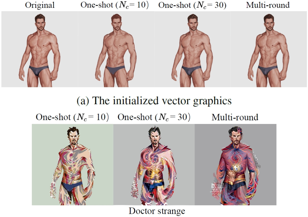 研究首先对比了多轮矢量化 (Multi-round) 策略和只进行一轮矢量化 (One-shot) 的效果。下图中第一行是矢量化后的初始结果,第二行是编辑后的结果。其中 Nc表示矢量化的精度。可以看到多轮矢量化不仅提高了初始状态的重建精度,并且能够有效消除编辑后矢量元素之间的裂缝,并增强细节表现。