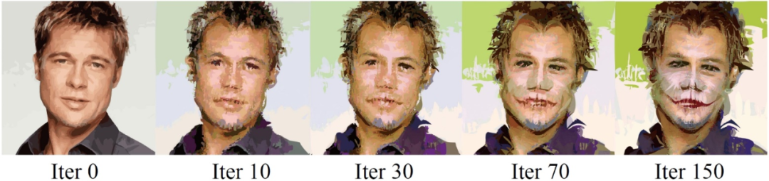 整个迭代优化的过程可见下例,其中的引导文字为”Jocker, Heath Ledger”(小丑,希斯 · 莱杰)。