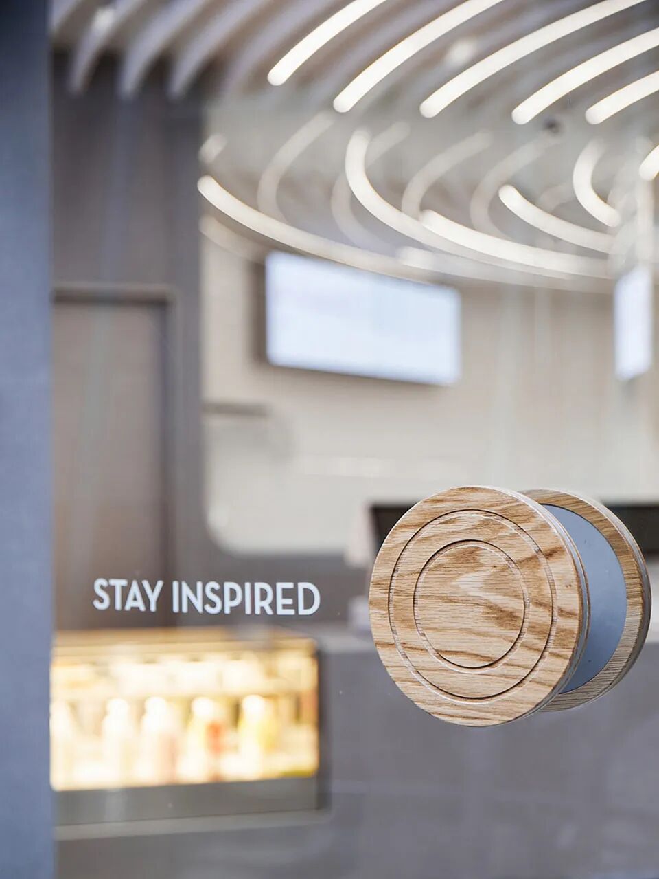 门店外摆区,以人造石打造了围绕圆形建筑空间平行排布的弧形坐凳,坐凳上印刻有数个同心圆纹样在回应设计概念的同时,还能协助顾客放置饮品;不仅如此,入口处的木质门把手也同样沿用了同心圆的造型。由整体到细微,为到店的消费者打造了一处放松沉浸的梦幻空间。