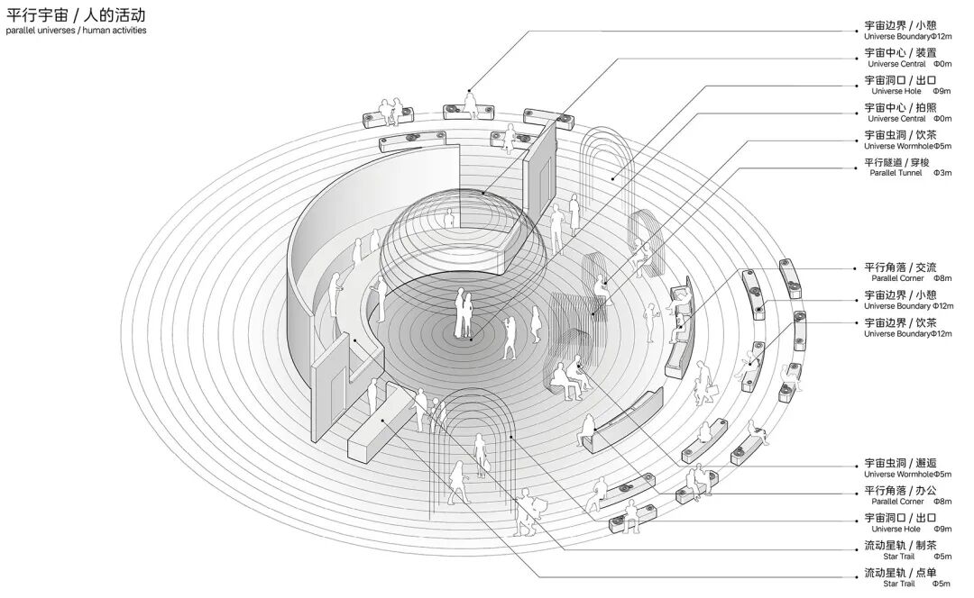 Formed by parallel lines, parallel space-times overlap in the building to connect all people. And this space becomes an independent complete parallel multiverse. People are attracted at the entrance to the universe, make tea in the moving planetary orbits, meet in the center of the universe, drink tea at parallel corners and take a rest beside the boundary of the universe…Here, people experience the integrity of universes, travel through time, relax mentally and enjoy eternity for a moment.