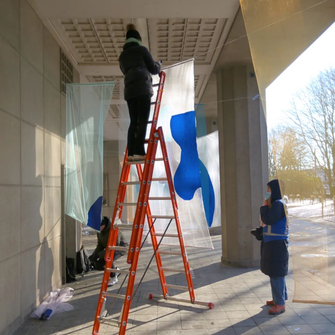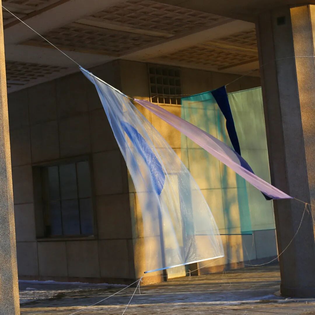 该项目位于比利时安特卫普,通过装置环境设计,我们暂时缓和了位于 Langblokken 一楼的均质、静态走廊空间的僵硬。静态结构的严格顺序和底层空间的朴素物质性很难让空间流动起来。类似隧道的效果限制了视野,需要减速。彩色和透明面纱的实施软化了周围环境和硬边缘的刚性和粗糙度。该装置通过悬挂多种颜色和材料的过滤器,突破了走廊的无尽长度。风、太阳光线和运动被捆绑、反射和重组。通过将不透明层与有机形式重叠,在它们之间投射出新的阴影。穿过装置作为走廊的新诗意体验。