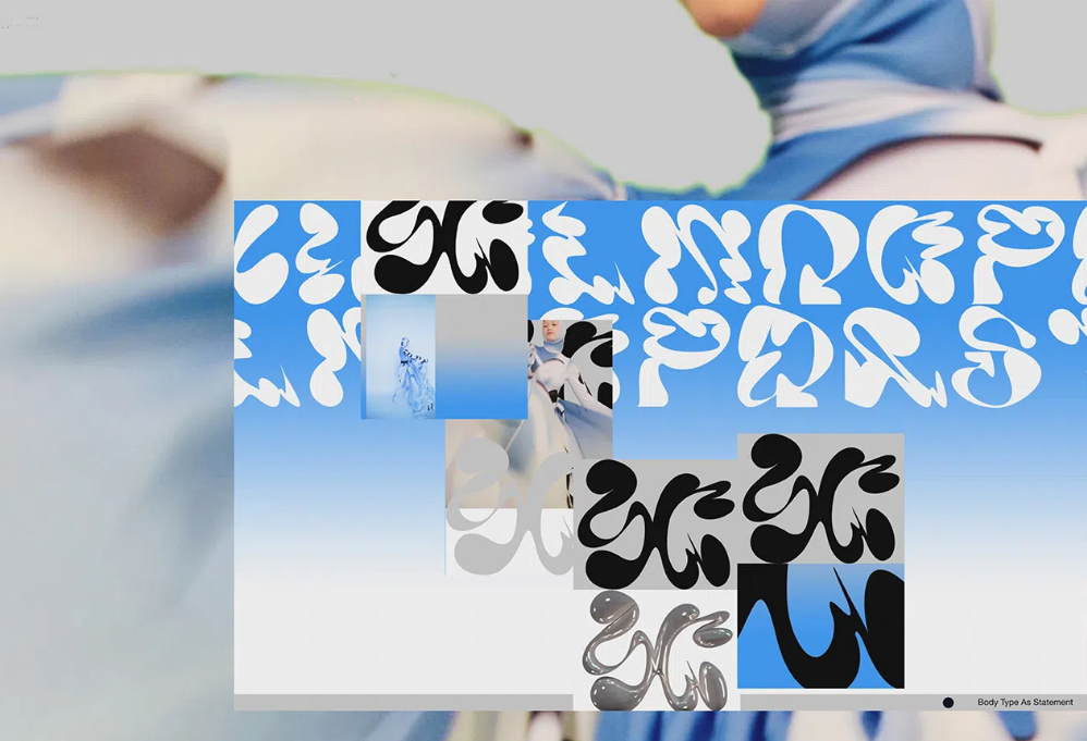 设计作品 Body Experimental Type 的字体运用不仅是探索物理身体,还探索视觉环境中的身体概念的表达。字体运用身体作为媒介,通过编舞和表演感知字体变化,为字体注入了情感。在展览视觉材质选择方面,窗体采用金属银色乙烯基, 赋予其立体感和科技感。该项目获得了美国纽约第100届ADC Award 字体设计银奖。