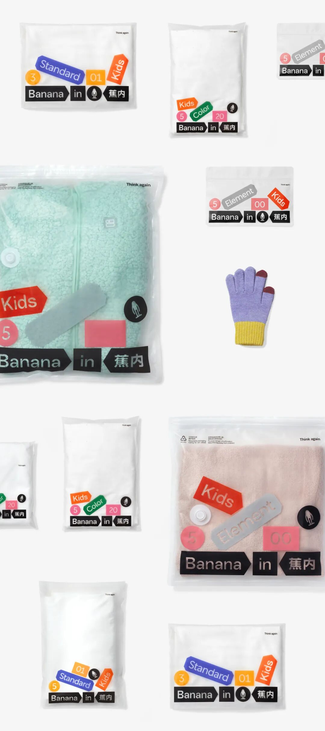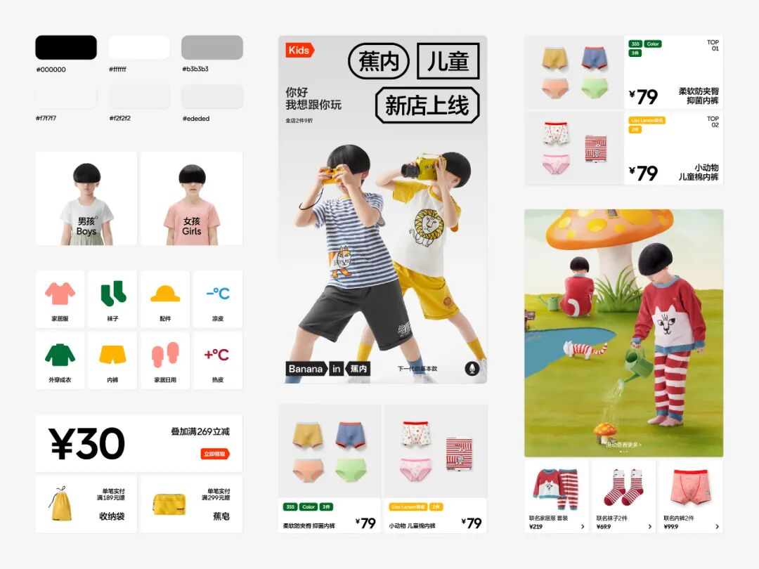 (动作2)色彩。儿童对于色彩是更敏感的,为了让孩子有机会体验更多的颜色,父母也更倾向于给孩子更多的色彩刺激,所以,蕉内儿童是一个更加缤纷绚烂的世界。包括标识与大标签在内的视觉元素都被重新染色,除了标识需保持在固定的色彩范围内,其他的内容都不再有过多的色彩限制。