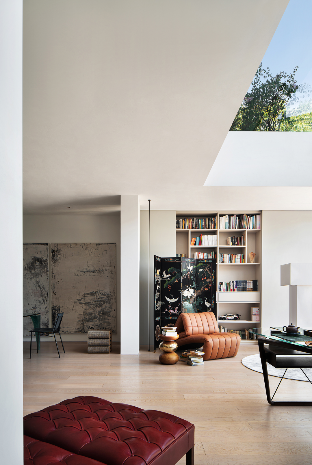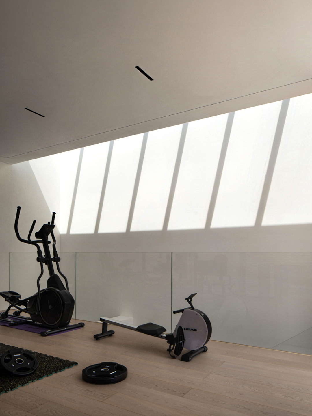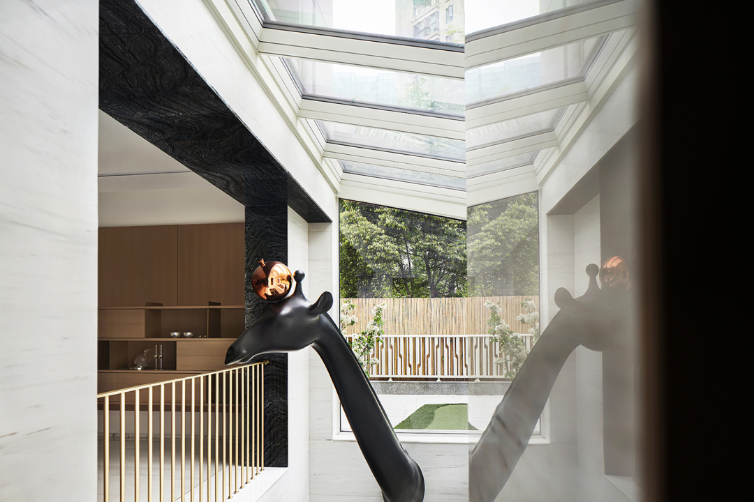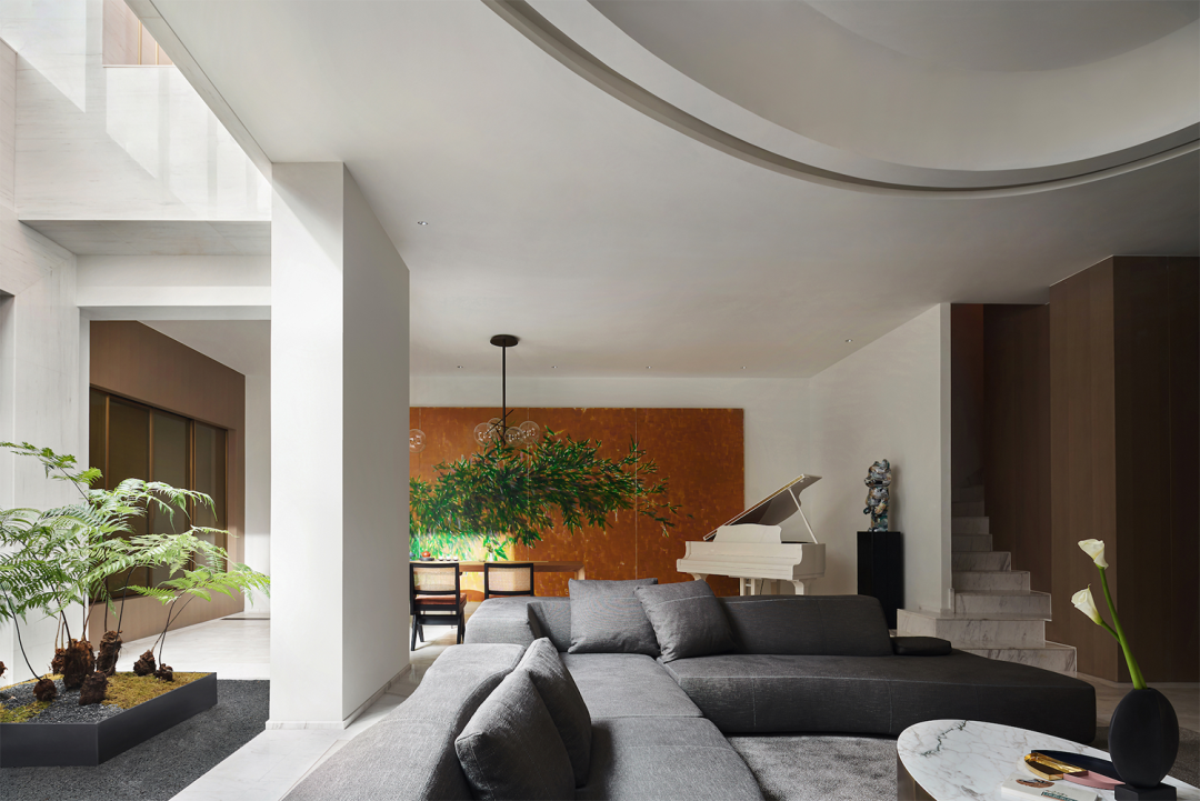 当倚湖而居、低密修心成为本案的鲜明标签时,设计师亟待解决的是更现实的改造难点 —— 深圳气候潮湿,本案又位于临水岸处,要将原本四层的别墅改造为六层,如何解决空间狭长且只在建筑两侧有光线与透气的问题?如何改变原建筑动线单一而缺乏趣味的状态?如何安放一家人舒适、有品位的现代生活?