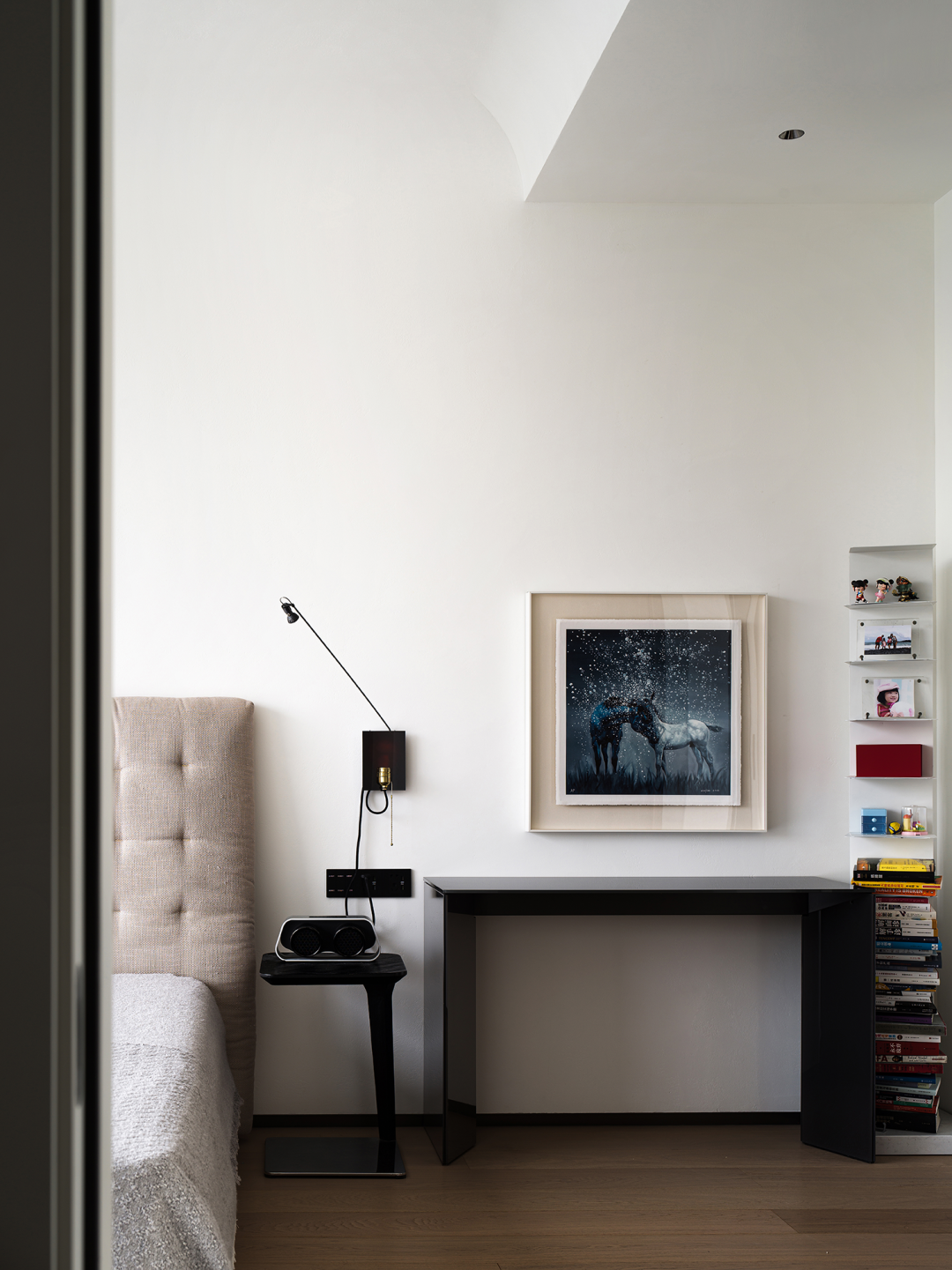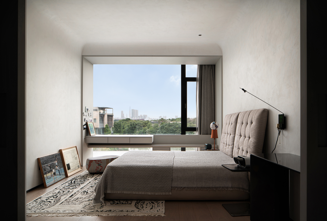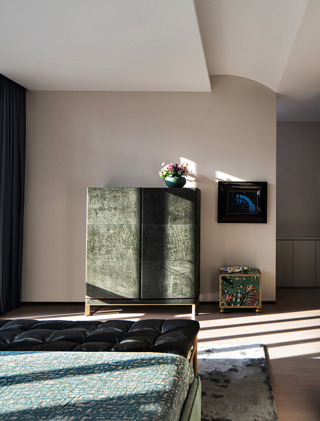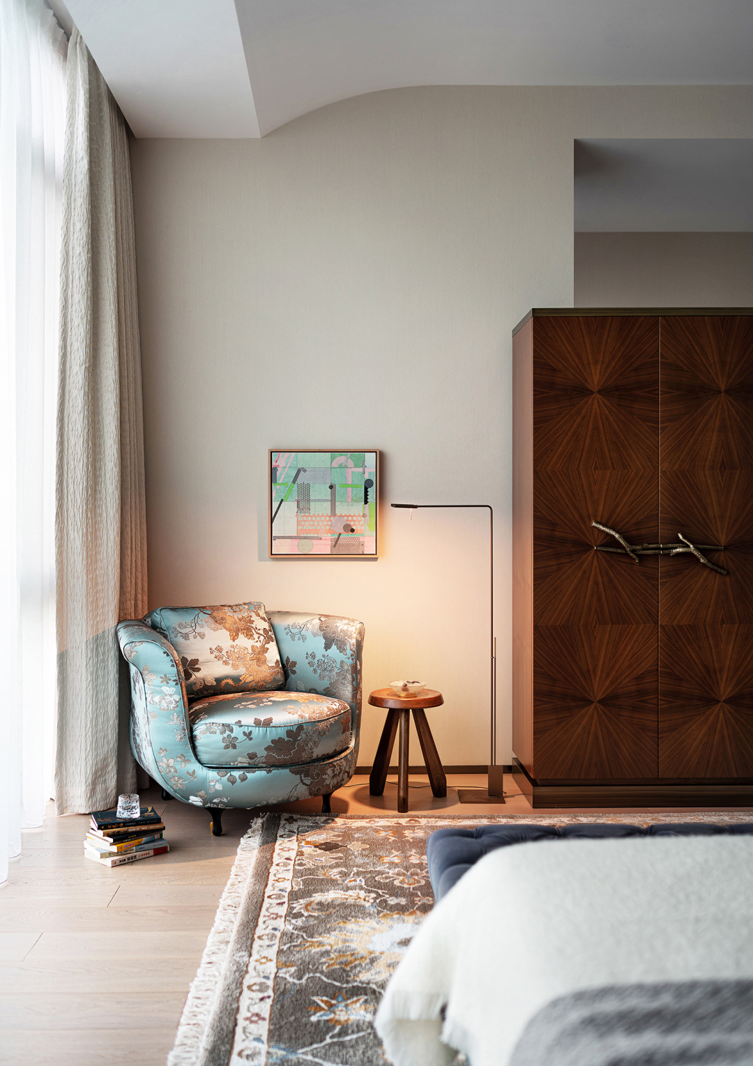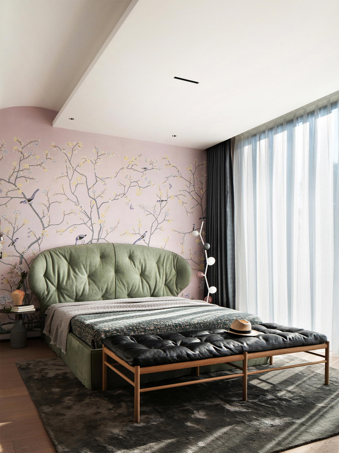 捕捉通透的光影、温柔的清风、纯粹的自然,空间的每一处场景细节雅趣生动,设计师于主卧延展艺术生活化的哲学,安抚身心,予人环境归属感。