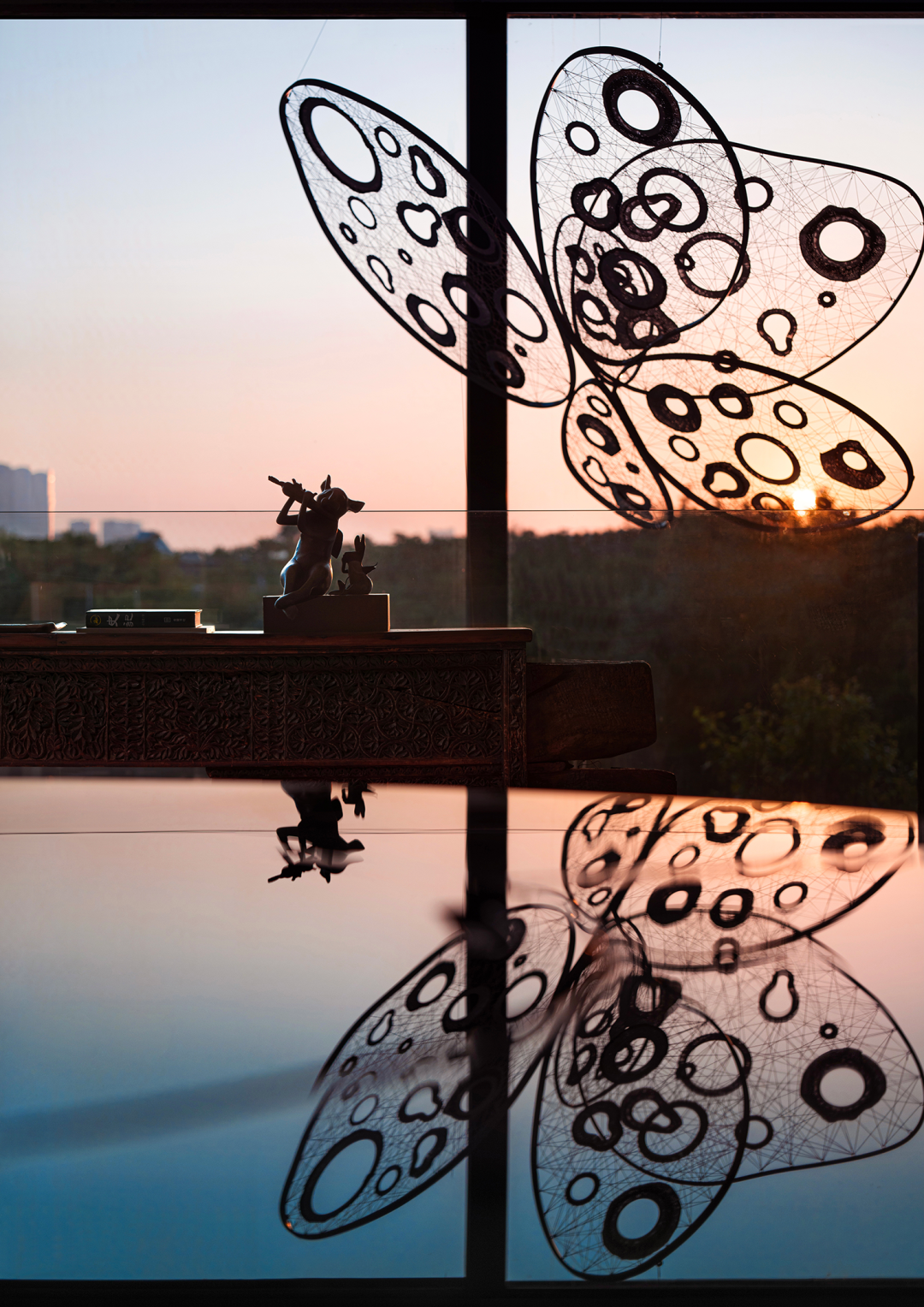 而一层与负一层之间形成的挑空格局,在蝴蝶艺术装置的点缀下,形成了超越自然的审美触点。这两只蝴蝶源自艺术家周力的作品《蜕变》,柔韧铁丝经由传统编织技法创作后,形态却轻盈而灵动,如同破茧而出的蝴蝶般展现出新生的张力。最终,两个独立层空间灵动串联,自由风光,频频停驻。