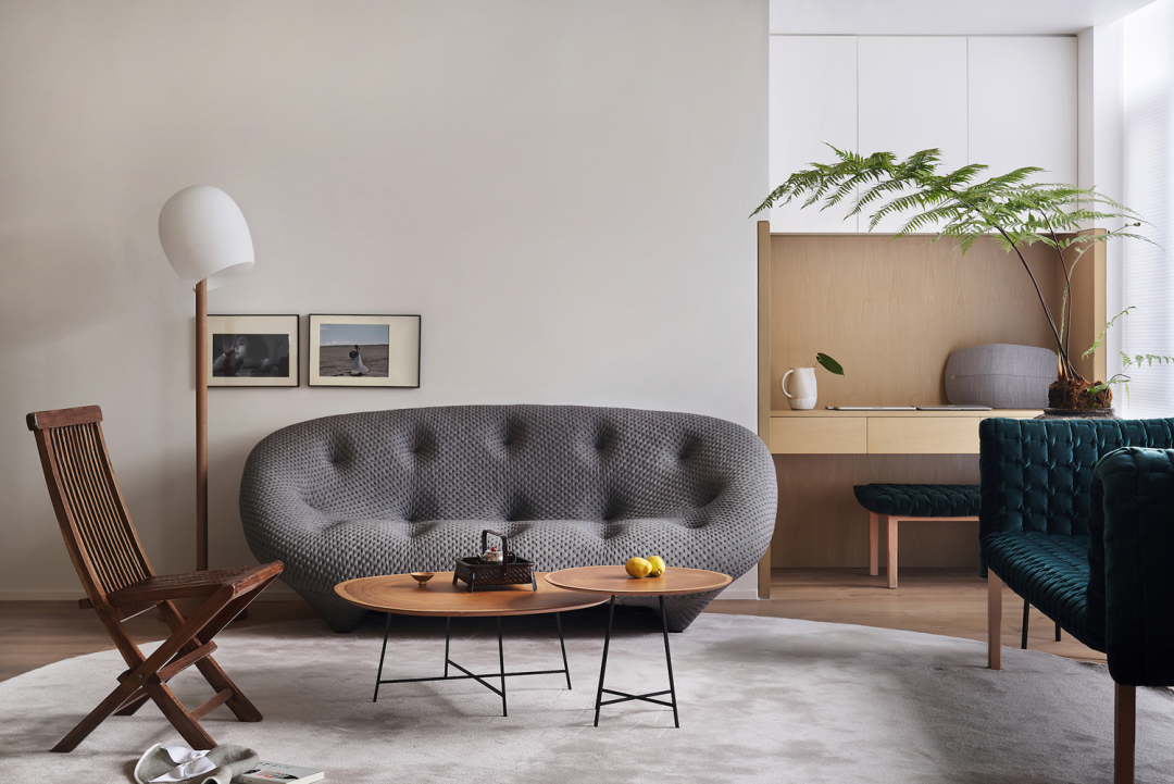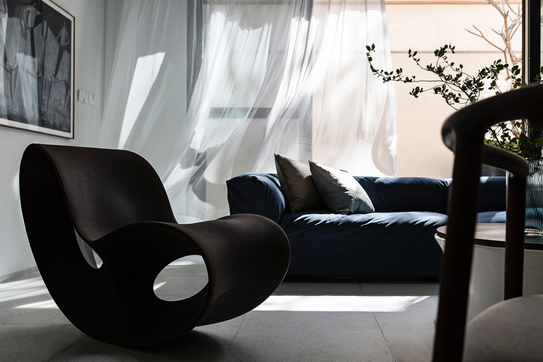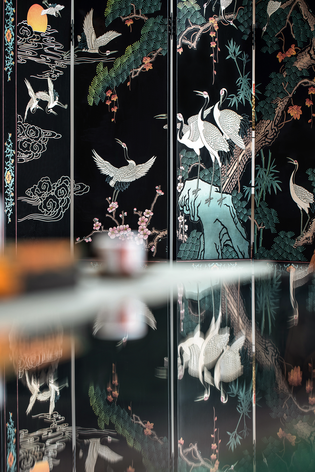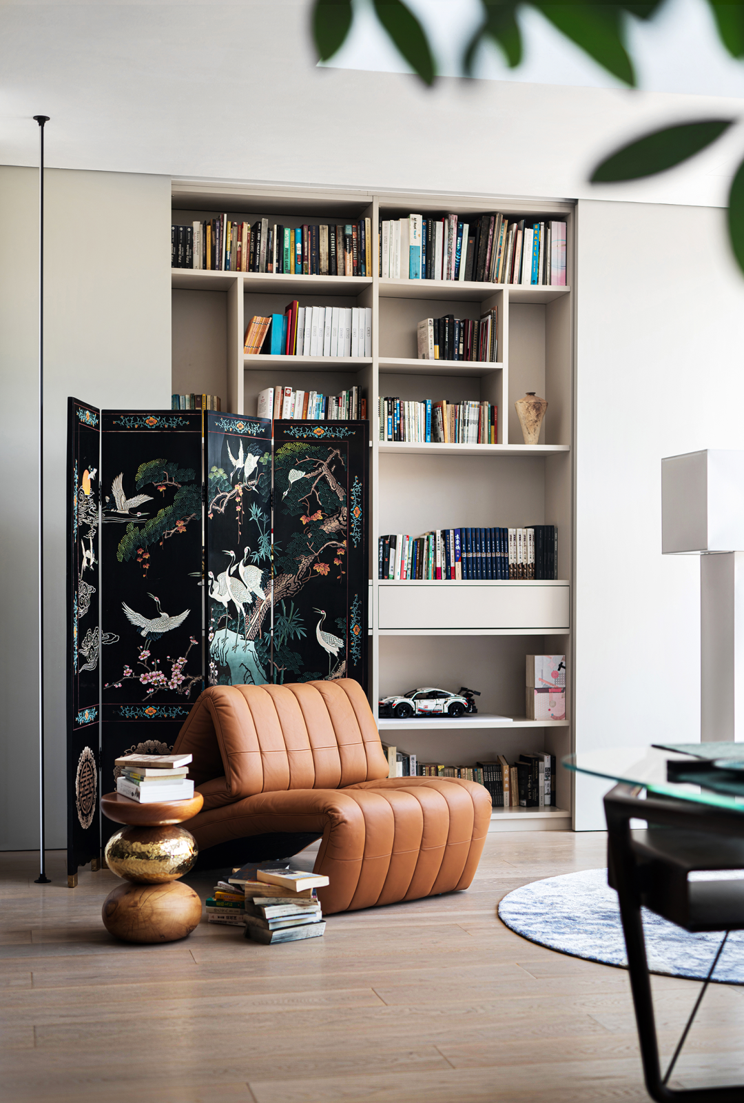 黑底仙鹤纹样的折叠屏风,将清清浅浅的东方诗意,渗入这一隅日常的角落,达成传统文化与现代住宅的审美交锋。此刻,和煦日光、四时盛景萦绕间,随手取一本书,尽享自在、舒适和平静的愉悦。