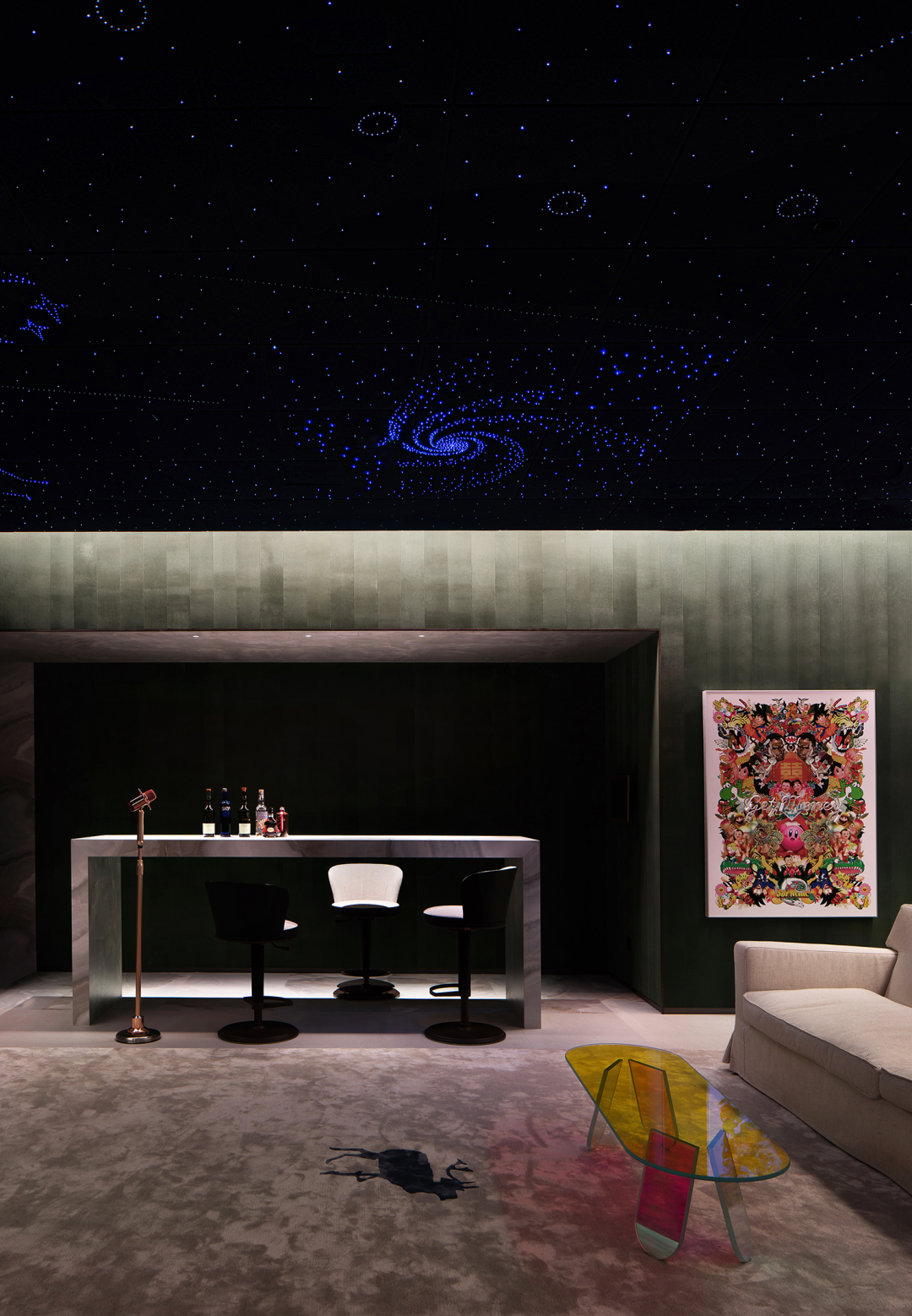 家的容器,即「人生剧场」,与艺术品位的终极造化隐约相契。设计师将空间主人藏酒、观影的生活喜好,落地为一个多元沉浸、艺术交集的“剧场” —— 犹如一支克罗地亚狂想曲,这场生动的故事,借由视错觉与缤纷色彩而盎然展开,直抵内心世界的丰赡。