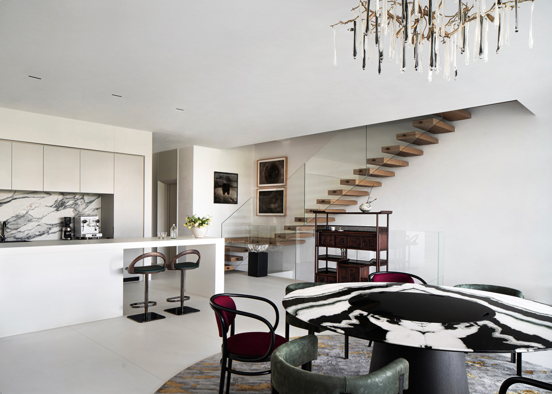 这里亦作为女主人偶尔下厨的场域,设计师以日常的艺术化渲染,令空间渐生雅趣,熠熠生辉,生活的滋味意蕴深长,家人互动的亲密温情,脉脉动人。