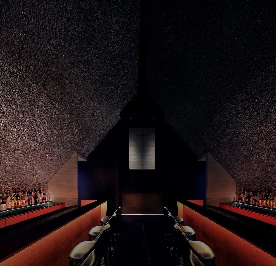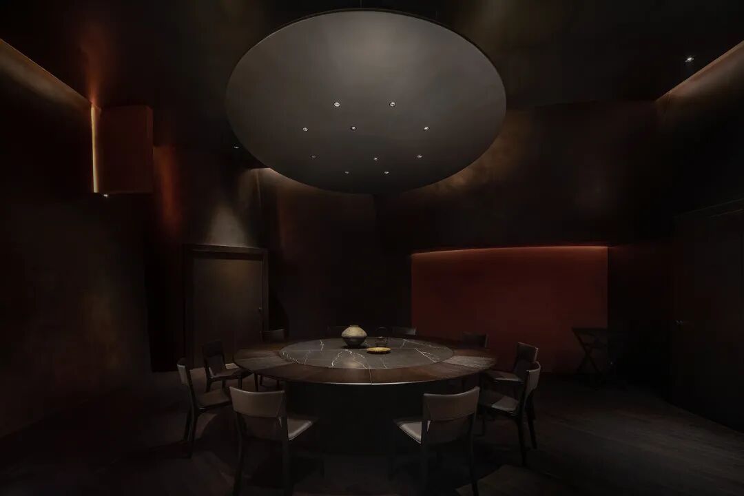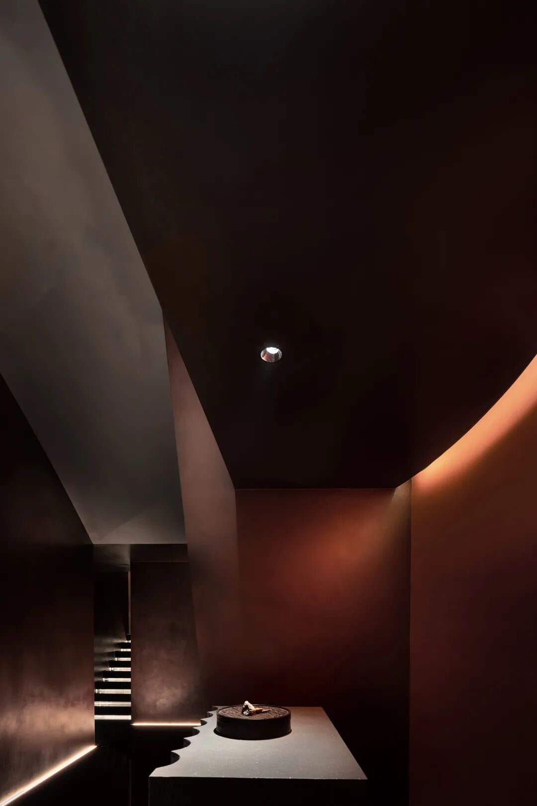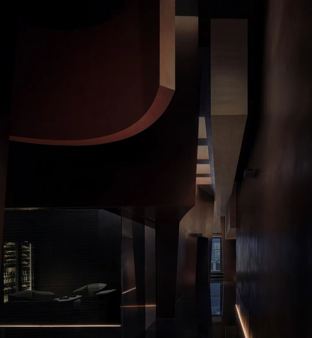 艾克建筑设计团队在设计“吴会所”时,便用西方的设计秩序来建树东方的空间情绪与哲学。暗黑系的空间让人充满了想要探索的欲望,并通过光来传达神秘、安静、虚幻的情绪与精神世界。不规则的几何的空间构成让现实变得虚幻,夸张的表达方式还会使人迷惑、混乱、向往。无论是小尺度的营造人与人的紧密性,还是策略性地将空间压低将人的情绪带到空间中心的位置,都显示出谢培河在设计中主张以感性丰富驾驭理性简约,怀抱强烈的情感张力和原创精神。“就像一个出生的婴儿进入了新界面,一切充满未知与惊喜。”他在Andrew Martin Day设计论坛这样表达了自己的情感。