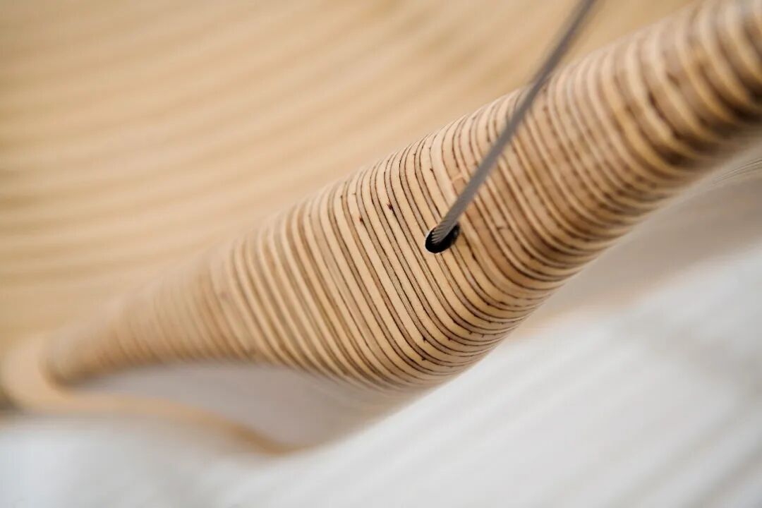 这把模仿人体脊椎的吊椅也很有意思,外观带来强烈的视觉冲击,整体用木材打造,十分有质感。