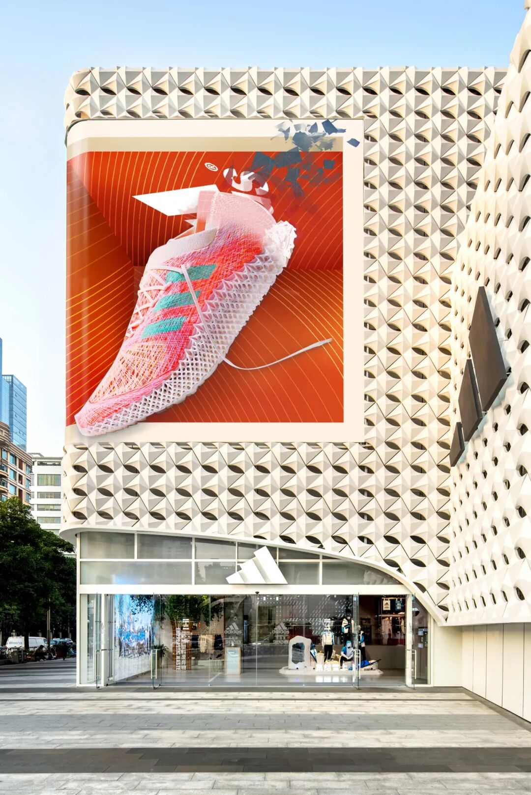 Storeage 通过对阿迪达斯特有的编织技术和图纹解构的研究,运用 AI 自然算法生成包裹整个建筑体的外立面,致敬阿迪达斯所创造的代表高性能运动鞋的针织技术。