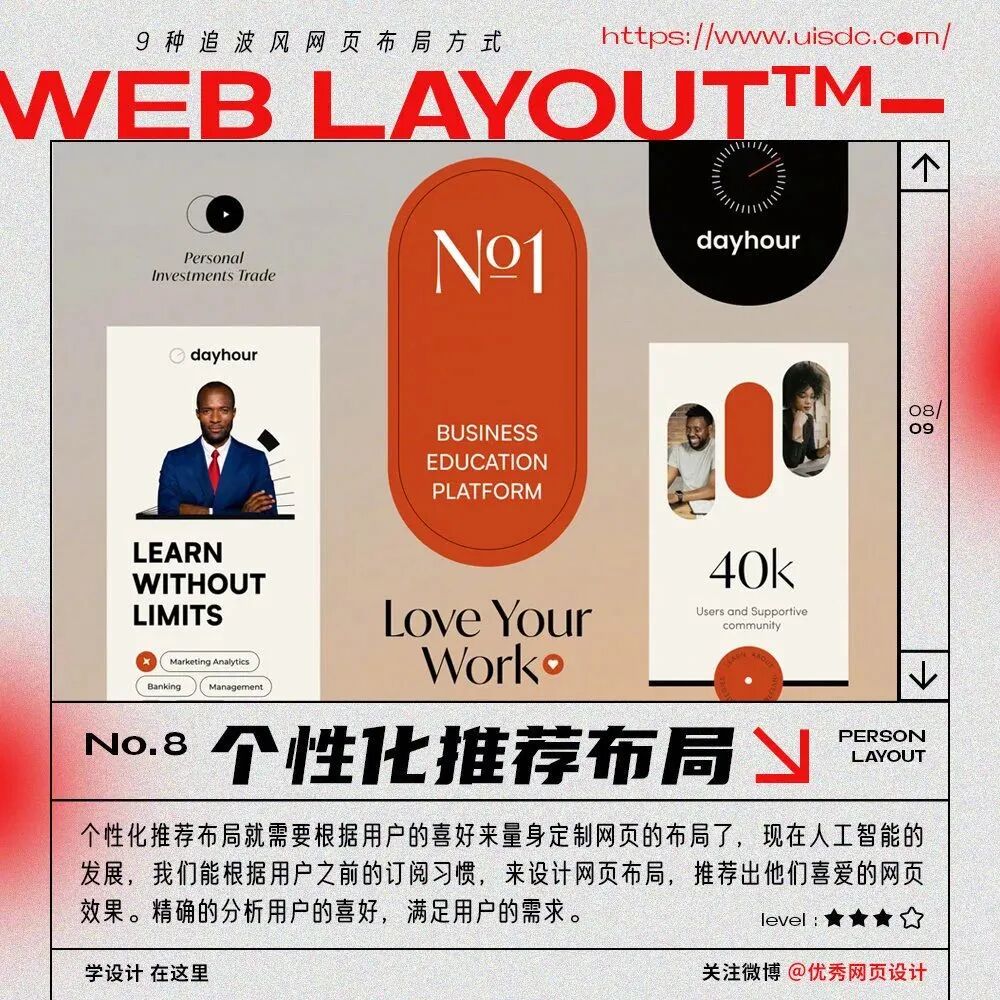 今天分享的内容,强烈推荐做网页设计的小伙伴一定要看看,9种Dribbble风网页布局方式,潮流前卫,满满的设计感:卡片式布局、分屏布局、纯文字布局、网格式布局、杂志版式布局、单页布局、Z型布局、个性化推荐布局和居中布局。这9种网页布局方式说是永不过时也不为过,了解这些网站设计布局结构,可以帮助你在做页面设计的时候形成一个框架,减少构思和推翻时间。以后做设计的时候,就能知道自己想做什么样子了。