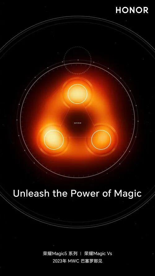 荣耀宣布将在 MWC 2023 上发布荣耀 Magic 5 系列手机,以及 Magic Vs 折叠屏手机的海外版,发布会定档北京时间 2 月 27 日 20:30。根据此前消息,荣耀 Magic5 系列手机将包括荣耀 Magic5、Magic5 Pro 和 Magic5 至臻版。荣耀 Magic5 系列预计搭载骁龙 8 Gen 2 芯片,配备 6.8 英寸护眼柔性屏,支持 100W 有线快充、50W 无线快充,还支持结构光和 IP68 防水防尘。