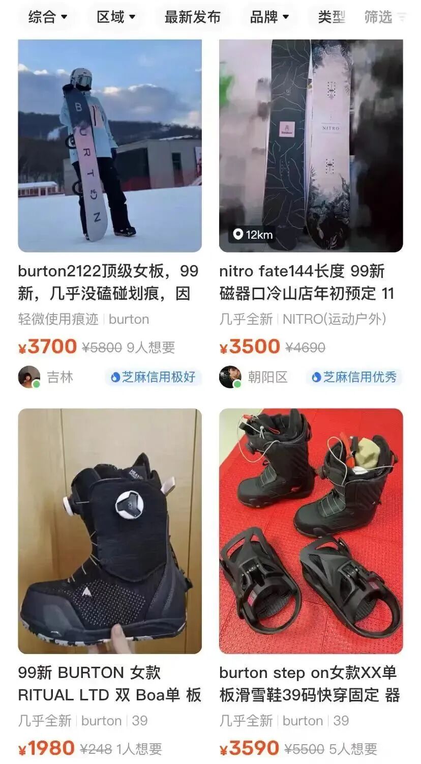 然而,在最近的咸鱼上,“99新滑雪板”成为一种独特的季节限定产品,售卖用户们普遍指出,“学不会”、“骨折弃坑”、“为上镜败家”和“冲动消费”是主要的出手原因,“滑雪啊,想爱,但很难。”