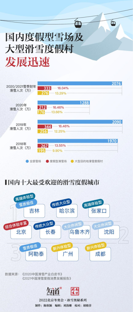 《南方周末》指出,近年城郊度假型滑雪场以及大型目的地滑雪度假区得到发展,前者滑雪人次占比已超过16%,后者滑雪人次占比已达到13%以上。除此之外,滑雪市场将逐步由初级体验市场过渡到以北京-崇礼、吉林省、长白山-通化、哈尔滨-亚布力、阿勒泰五大滑雪旅游目的地为核心的休闲度假市场。