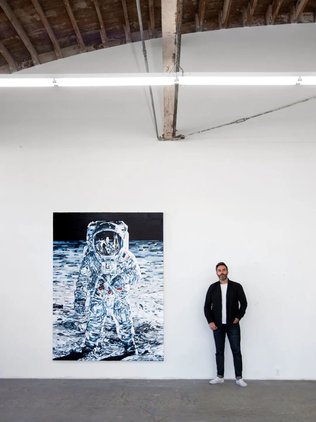 迈克尔·卡根于1980 年出生于美国维吉尼亚州,2003 年从华盛顿大学获得艺术学士学位,2005 年从纽约艺术学院获得艺术硕士学位。现在工作生活于纽约布鲁克林卡根标志性的大尺幅油画作品经常围绕太空、航天飞机等主题而展开,并深入探讨了探险家,即宇航员的身体和情感旅程。他的绘画以充满细节刻画的实体物件融合于充满氛围的画面表达艺术家自身对神秘的太空宇宙所抱持的向往,也让观众感受外太空的深邃。卡根运用粗犷、充满力道的笔触作画,所构成的画面也带有几分印象派风采,带来对绘画主题的深切清晰又不失迷人的描绘。
