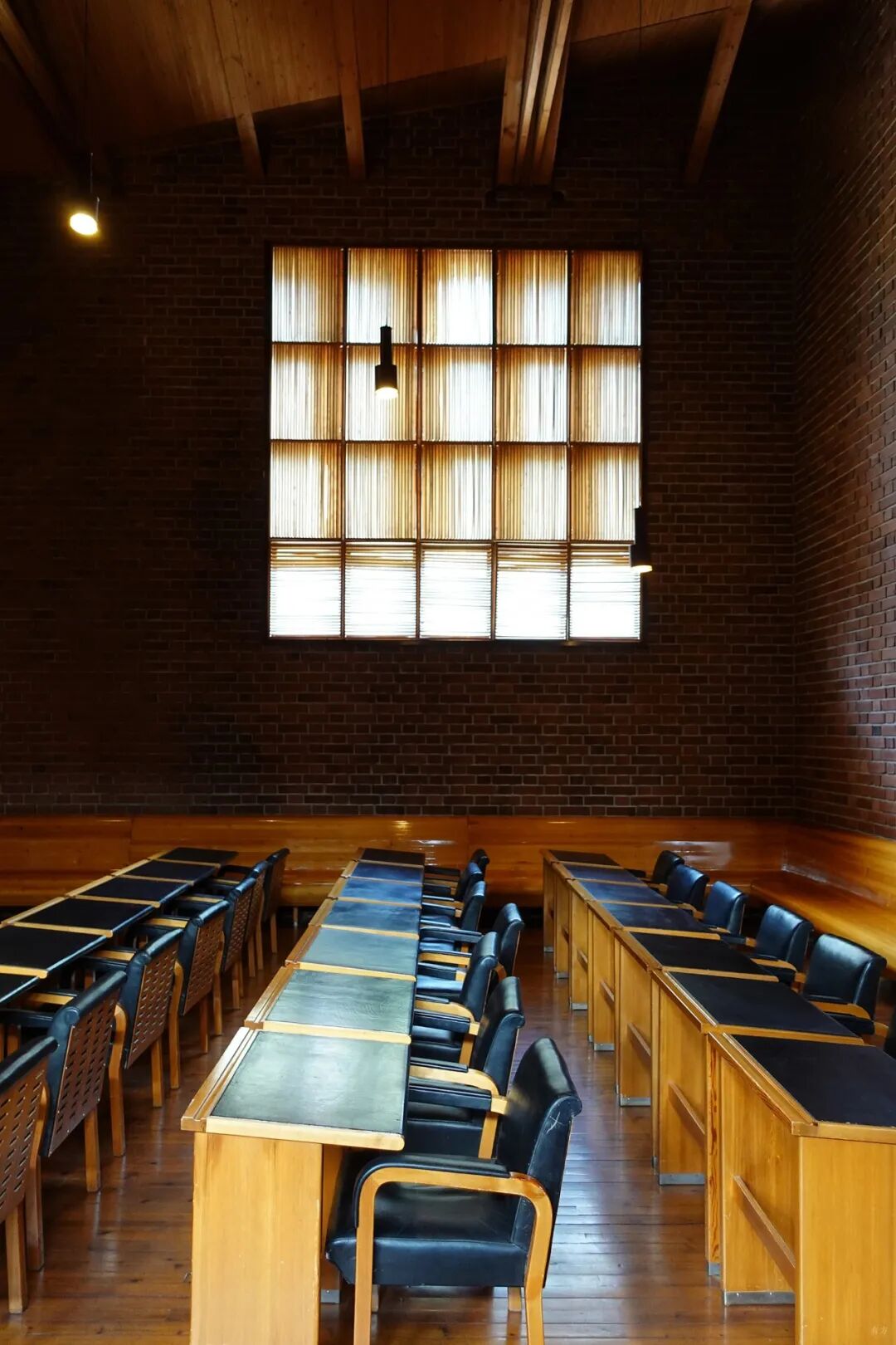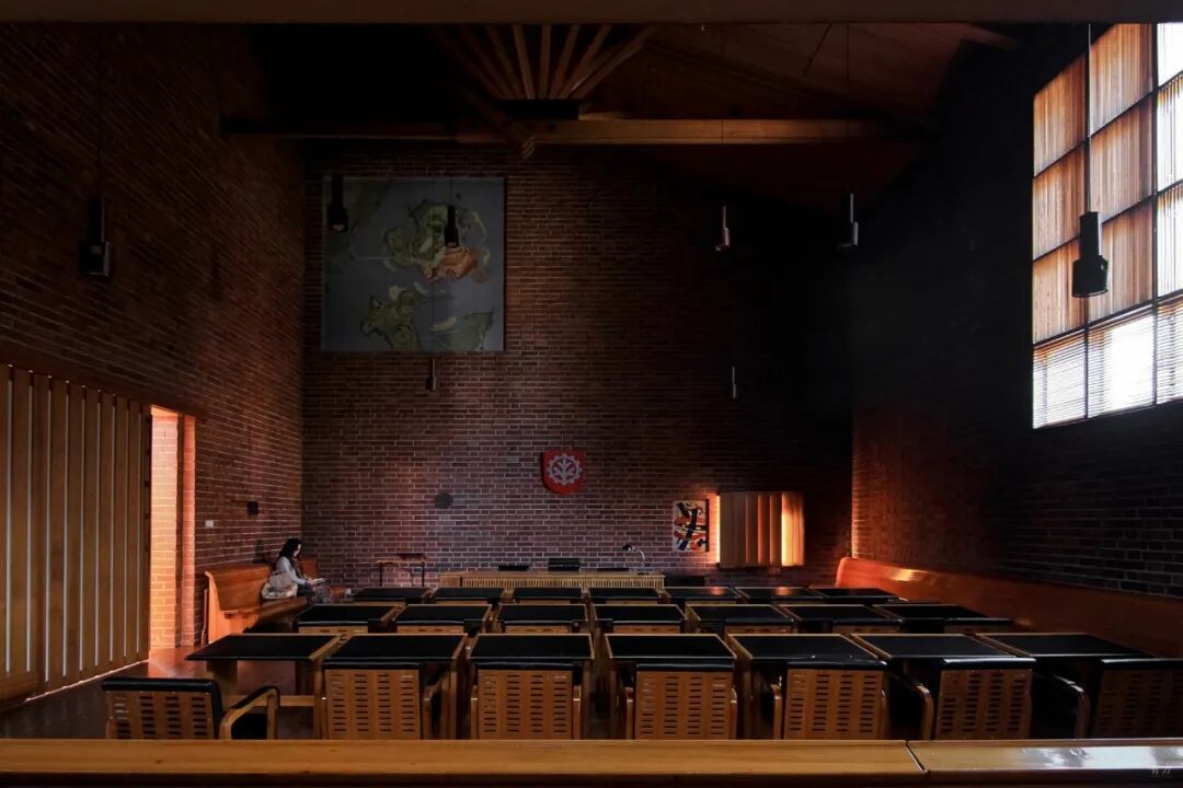 想要到达会议室,需要经过一个略微狭窄昏暗的砖墙楼梯间。楼梯间的采光依靠东向的高窗,使楼梯间内部无法被外面的行人看见,楼梯上升一半的位置有一段转折,使得会议室内部被遮蔽起来,实现了空间的私密性。