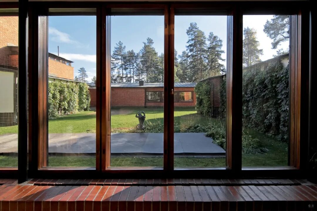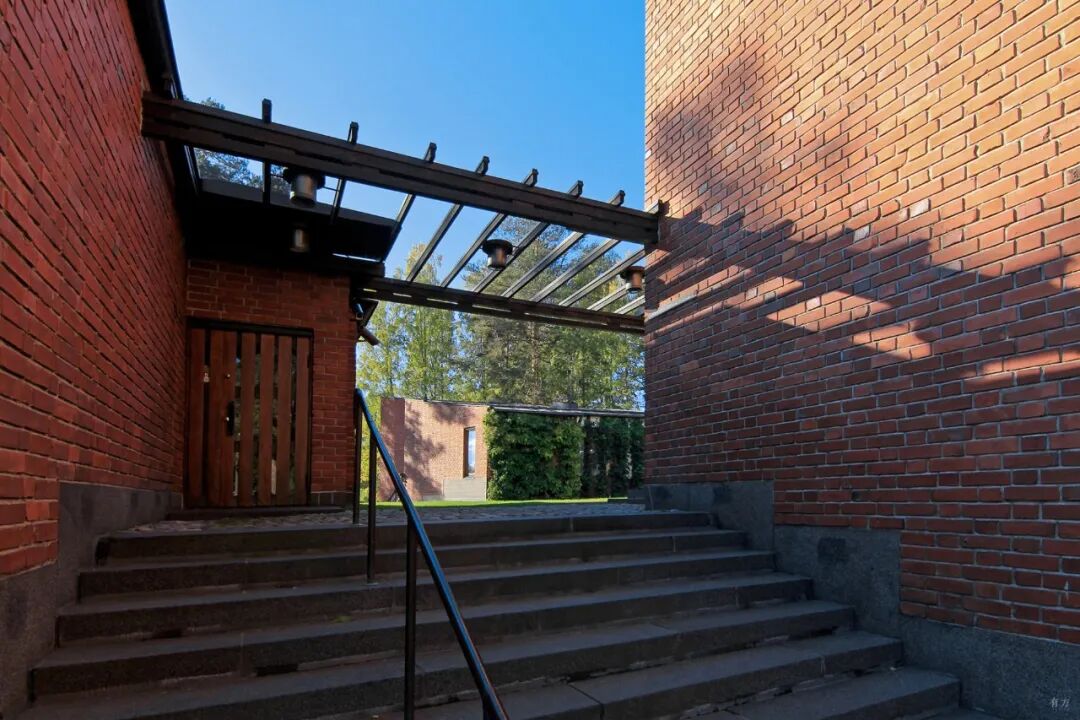 回字形市政厅在山坡上围合出一个封闭的庭院,阿尔托又用山坡上的土将庭院填满,这样使得小庭院高出地面一层。水平和竖直双维度上的分割使小院充满静谧的氛围,成为容纳书声、密语和沉思的良好容器。