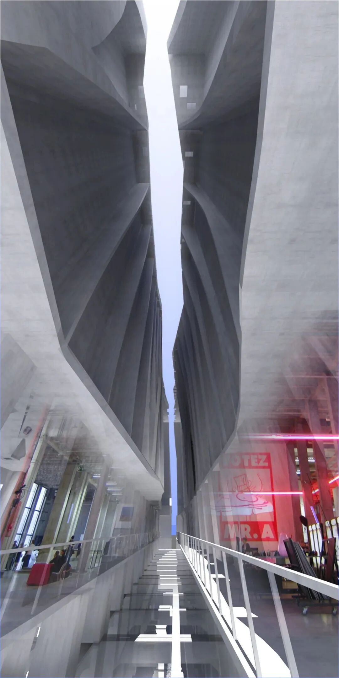 设计师通过建筑中心的深切口一举解决了以上两个挑战。纵深裂缝展示了筒仓的工业功能,同时也为其提供了建筑原有身份的证明;其次,裂缝的存在,创造出一个大型中央空间,仿佛在邀请人们到达这个工业建筑的 "心脏"。