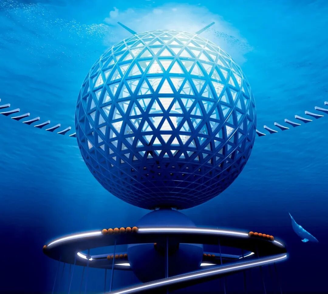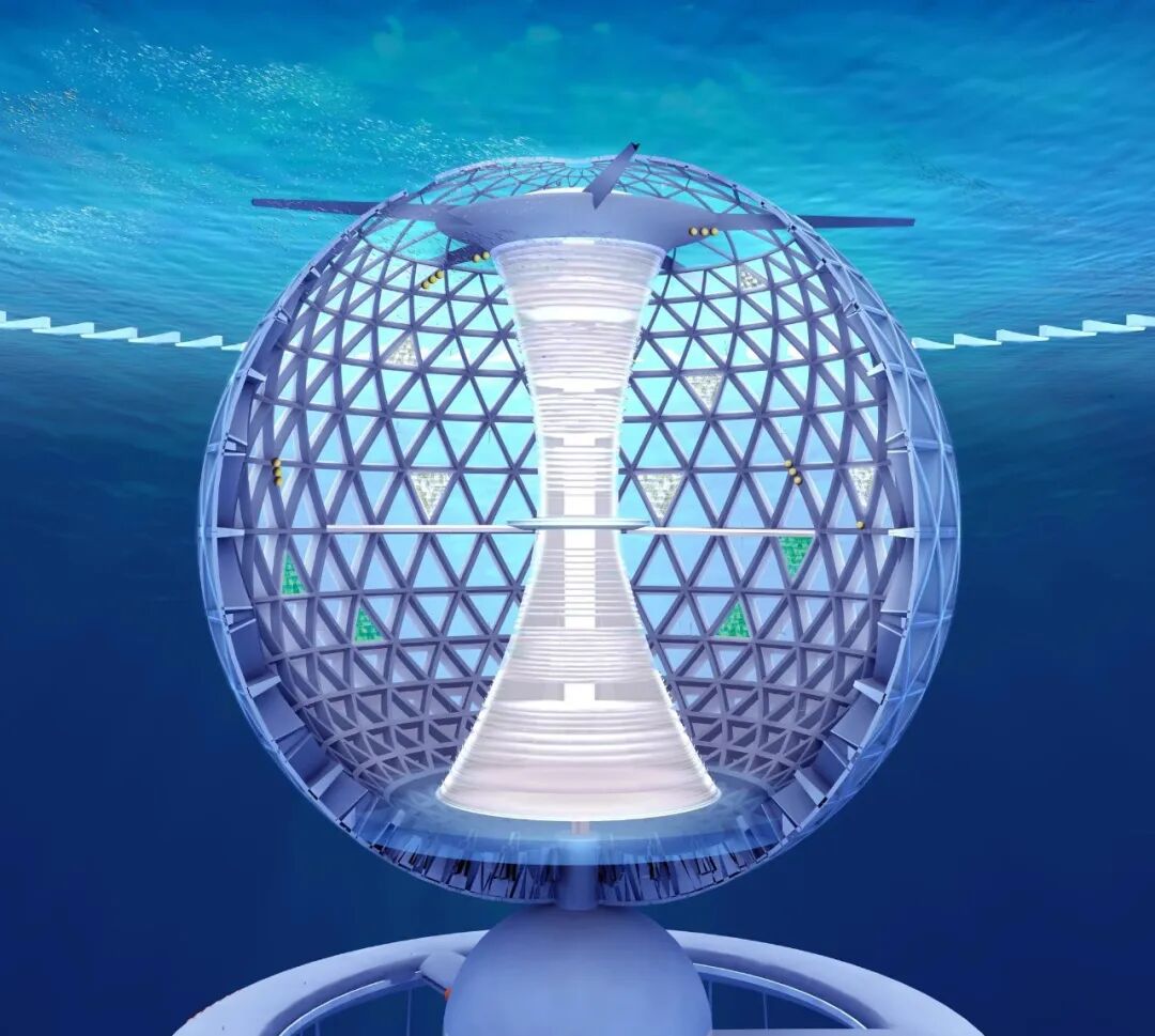 螺旋结构位于球形空间下方,作用是将球体与海底2.5英里处的基站连接起来,目的是为城市提供能源、淡水和食物等基本资源。