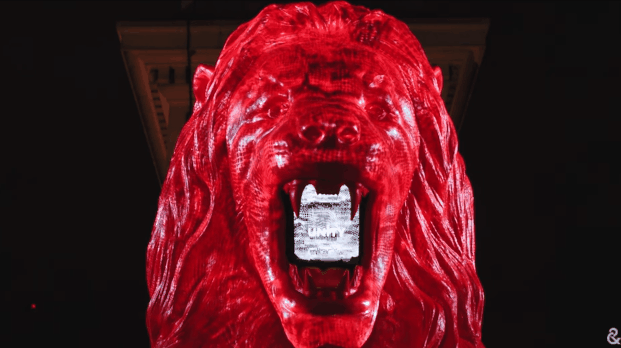 伦敦特拉法加广场(Trafalgar Square)有四只著名的石狮子雕塑, 在 2018 年伦敦设计节上,第五只荧光红狮子加入了这四位的行列,“来到”了特拉法加广场。