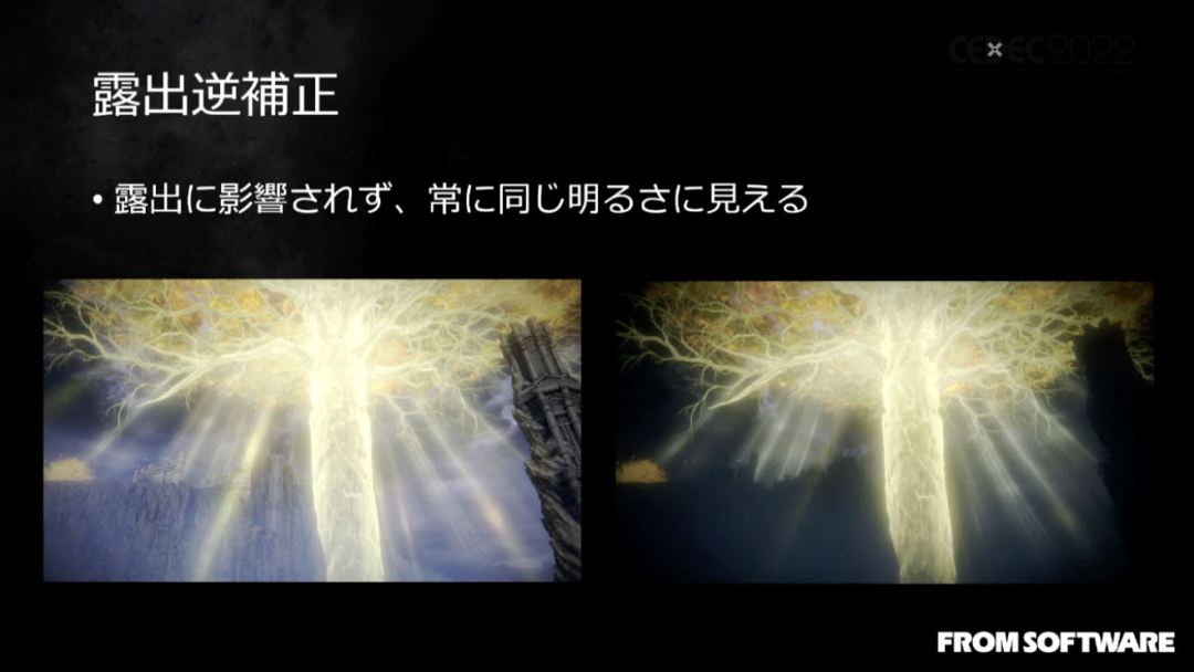 曝光逆补正,是针对特定材质,在不影响曝光值的情况下,让它在画面中总是呈现相同明亮度的功能。和特效中经常使用的东西是一样的,《艾尔登法环》在黄金树以及它的周遭光效上,都用了这个技术。