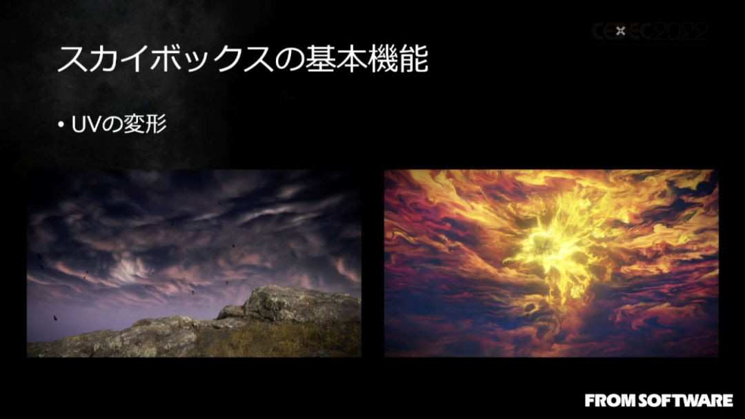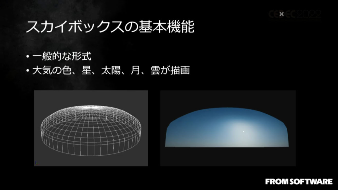 众所周知,Skybox是一套在半球状mesh或者板状多边形上,描绘天空颜色、星辰日月的功能。《艾尔登法环》里的天空表现也广泛运用到了这套技术,其中用到的贴图,则是在3DCG软件《Terragen》中制作的图像和照片素材。