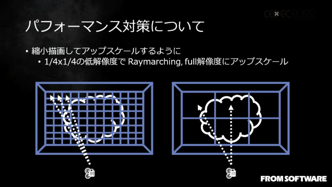 具体来说,就是先降低Ray Marching的颗粒度来计算,再对结果进行扩缩处理的手法。由于Ray Marching是以像素单位来计算的,所以在低分辨率下计算对优化的帮助很大,最终来看,单纯计算层面就能优化到之前的1/16。